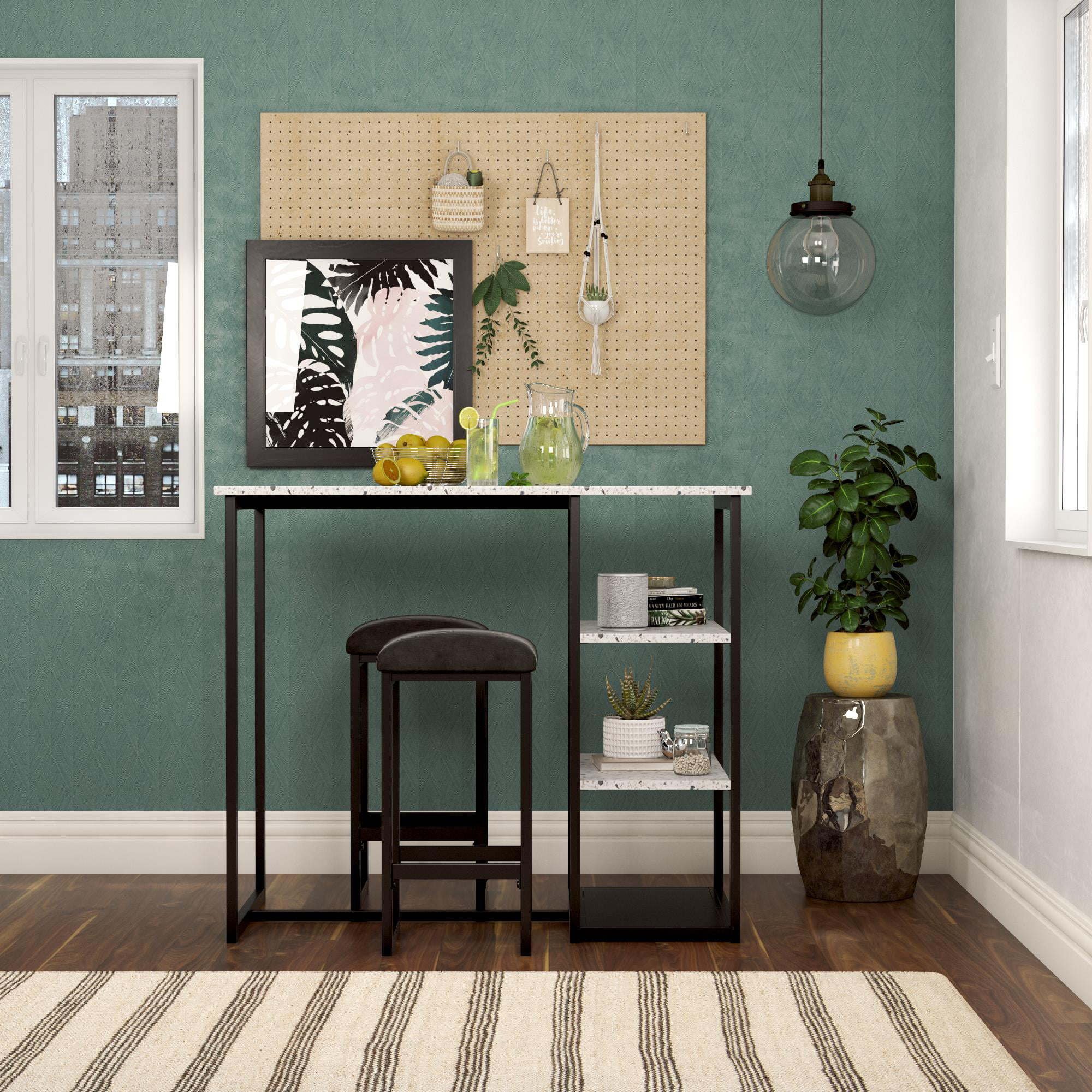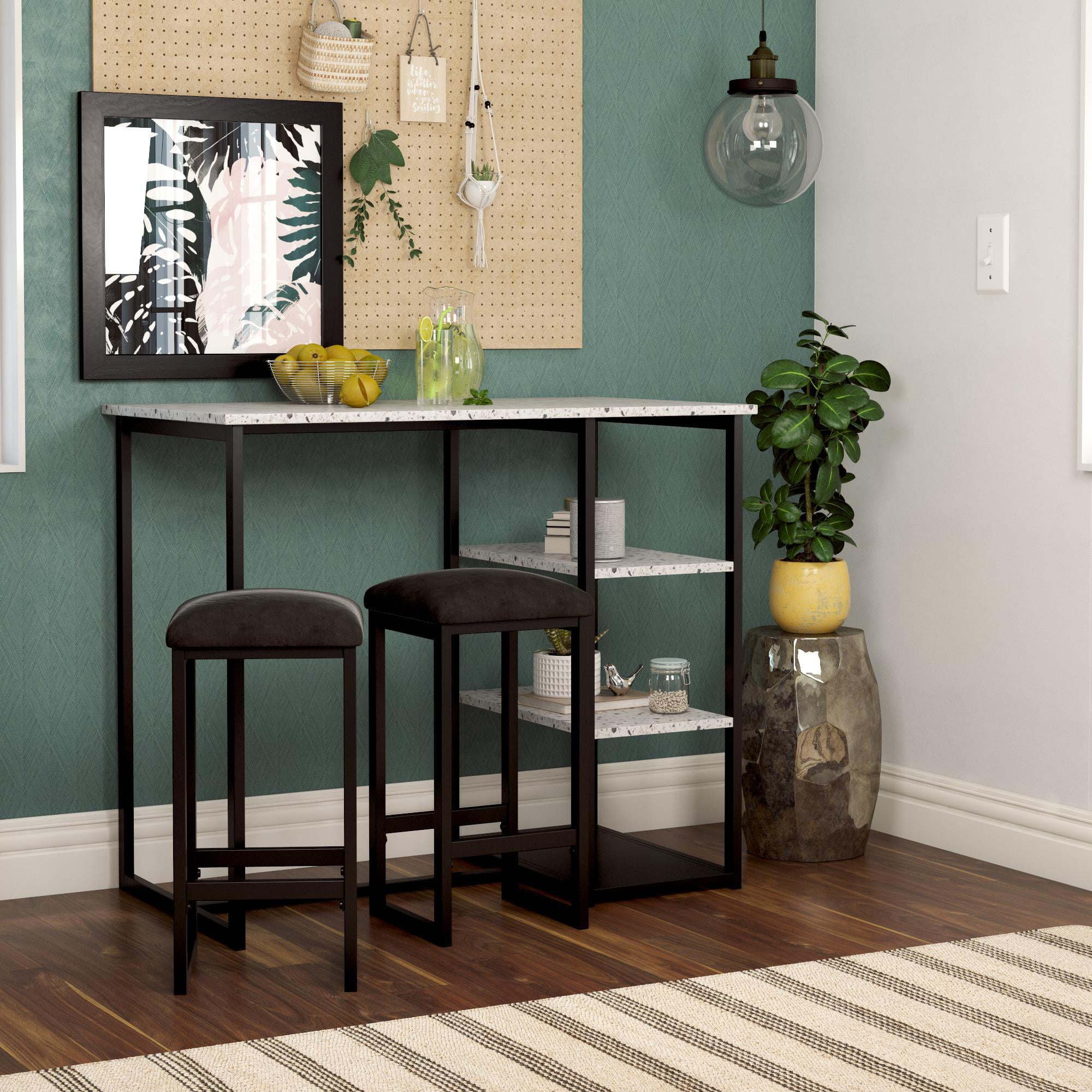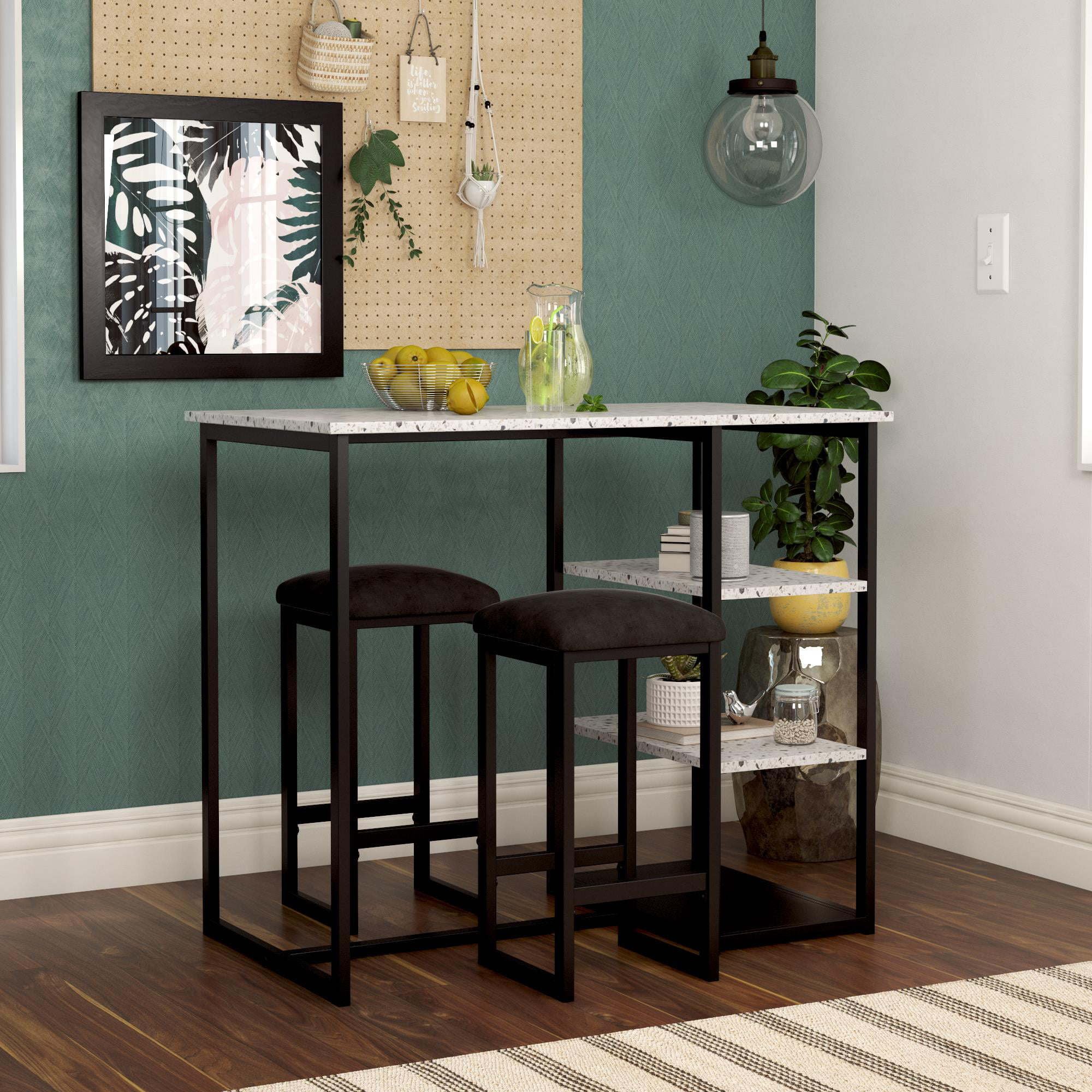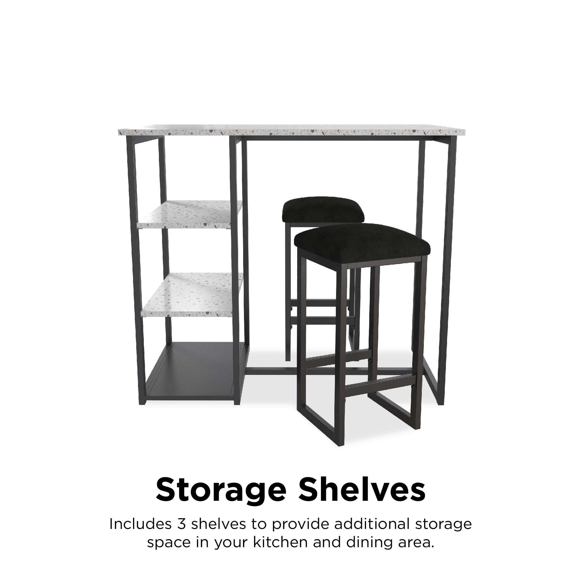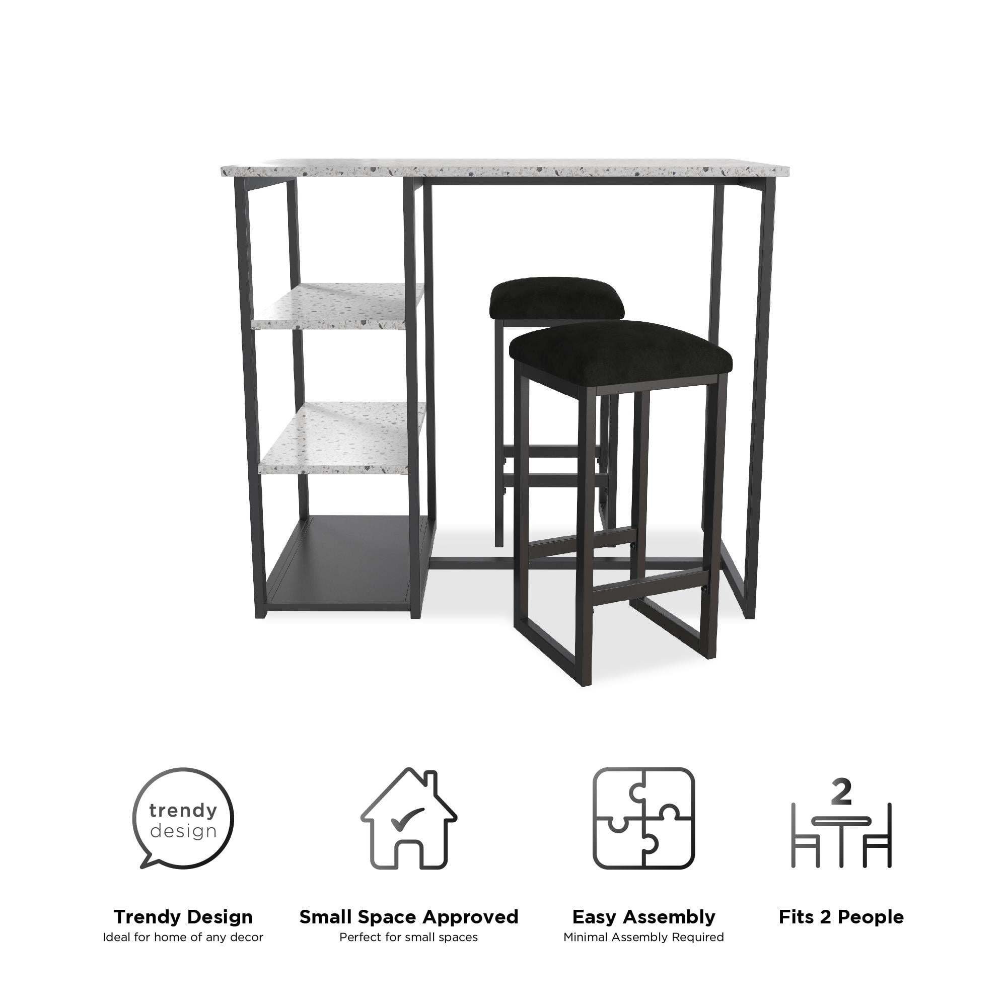 Step up the wow factor in your home with the 3-Piece Pub Set. This unique set is small space friendly with its slim construction and compact design. Its edgy contemporary style features a rectangular table with a faux terrazzo top that rests on top of a long sturdy steel metal frame. The two included backless counter height stools have the same steel metal frame with microfiber upholstered padded cushions that ensure optimal comfort. When not in use, the stools tuck in neatly under the table. This practical furnishing option also comes with side shelves that are practical for all of your storage needs. The Pub Set includes both the table and the two counter stools. The works well in open concept areas and in small living spaces including dorms, apartments and studios. Suited for casual entertainment and dining, the 3-Piece Pub Set will quickly become the statement piece in your kitchen or dining room.