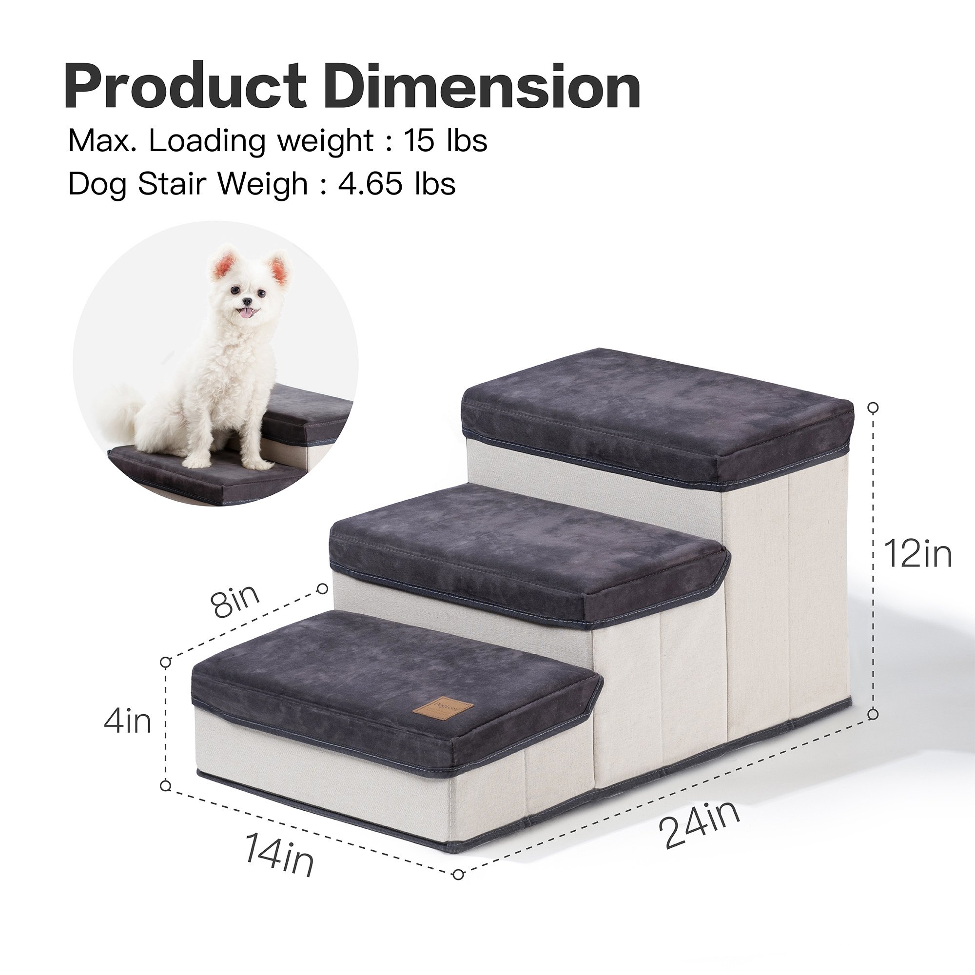 Soft fleece fabric will be loved by your pet. A good helper for your small dog to get up to the bed or couch easily; and it also perfect for dog with arthritis or other mobility issues.Easy to Assemble - Very easy to set up and fold back up if needed. You just put the board pad into stair bottom; cover the box and then finish the installation.Useful Storage Space - Super cute design and even has storage under each steps. They are great place to store their stuff; such as dog clothes; food; toys and other pet supplies.Perfect for Small Dogs - Dog stairs can make life easier for some small dogs to get up to the sofa or bed. Fold down for easy storage and very convenient to carry to anywhere you want.Why your dog need dog stair ?1) Help small dogs to jump successfully to the bed or couch;2) Protect dog's joints by reducing the number of times he leaps each day.3) Help dogs who recovering from an injury or surgery to reach his favorite perches.Package IncludesDog stair X 1Board pads X 3Package Box x 1