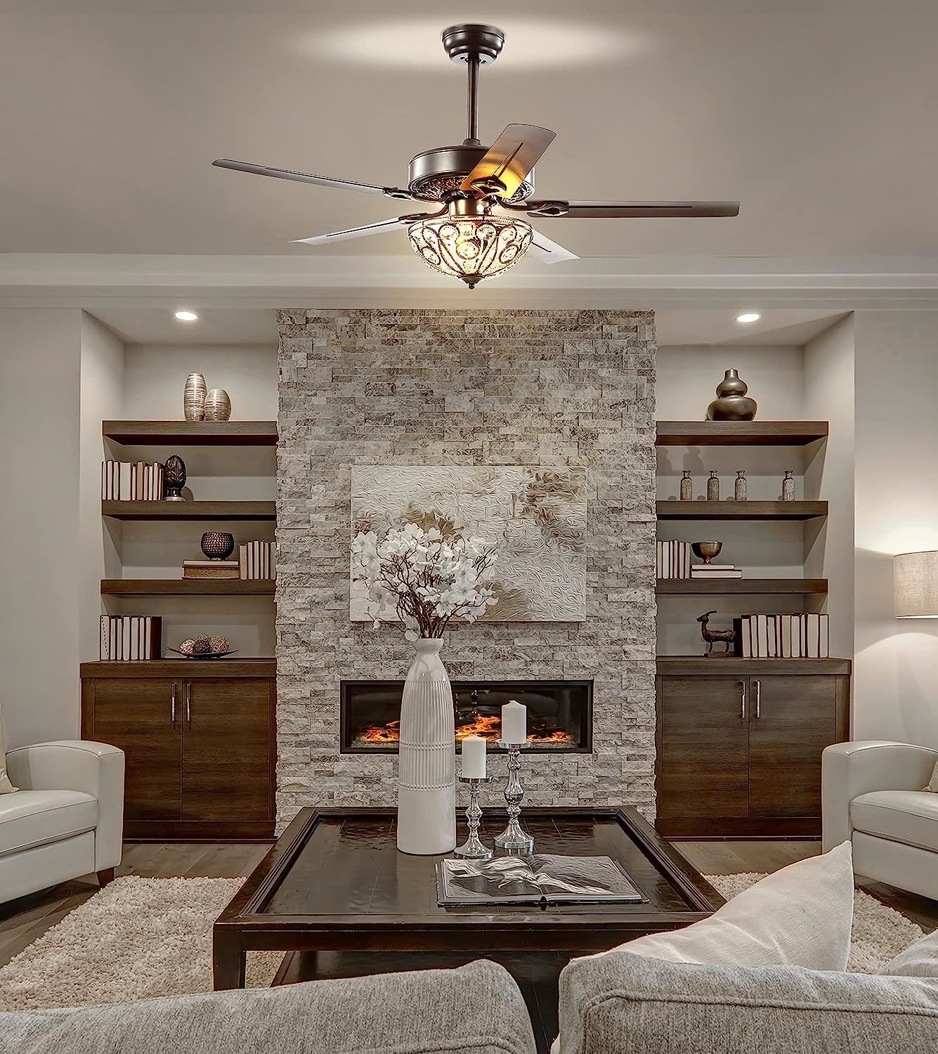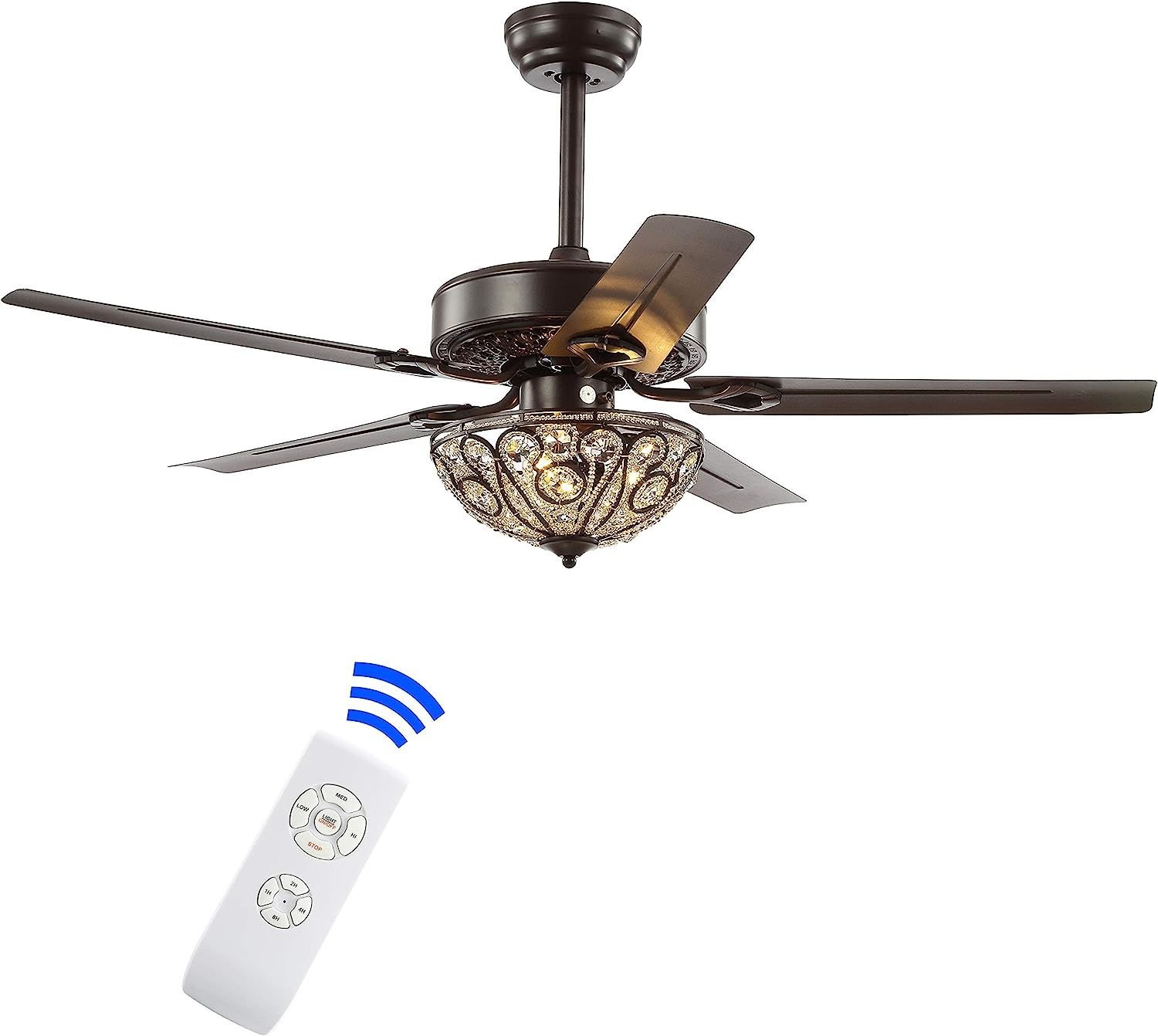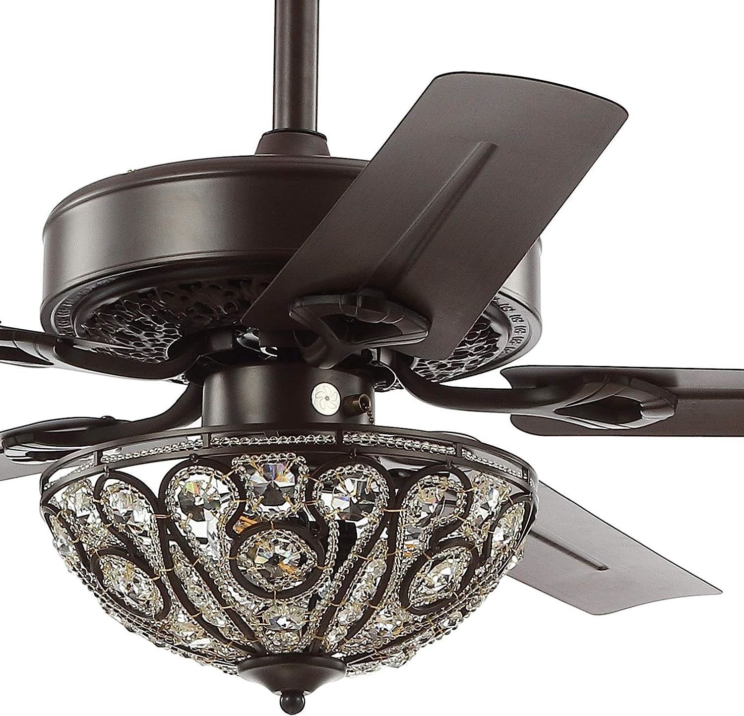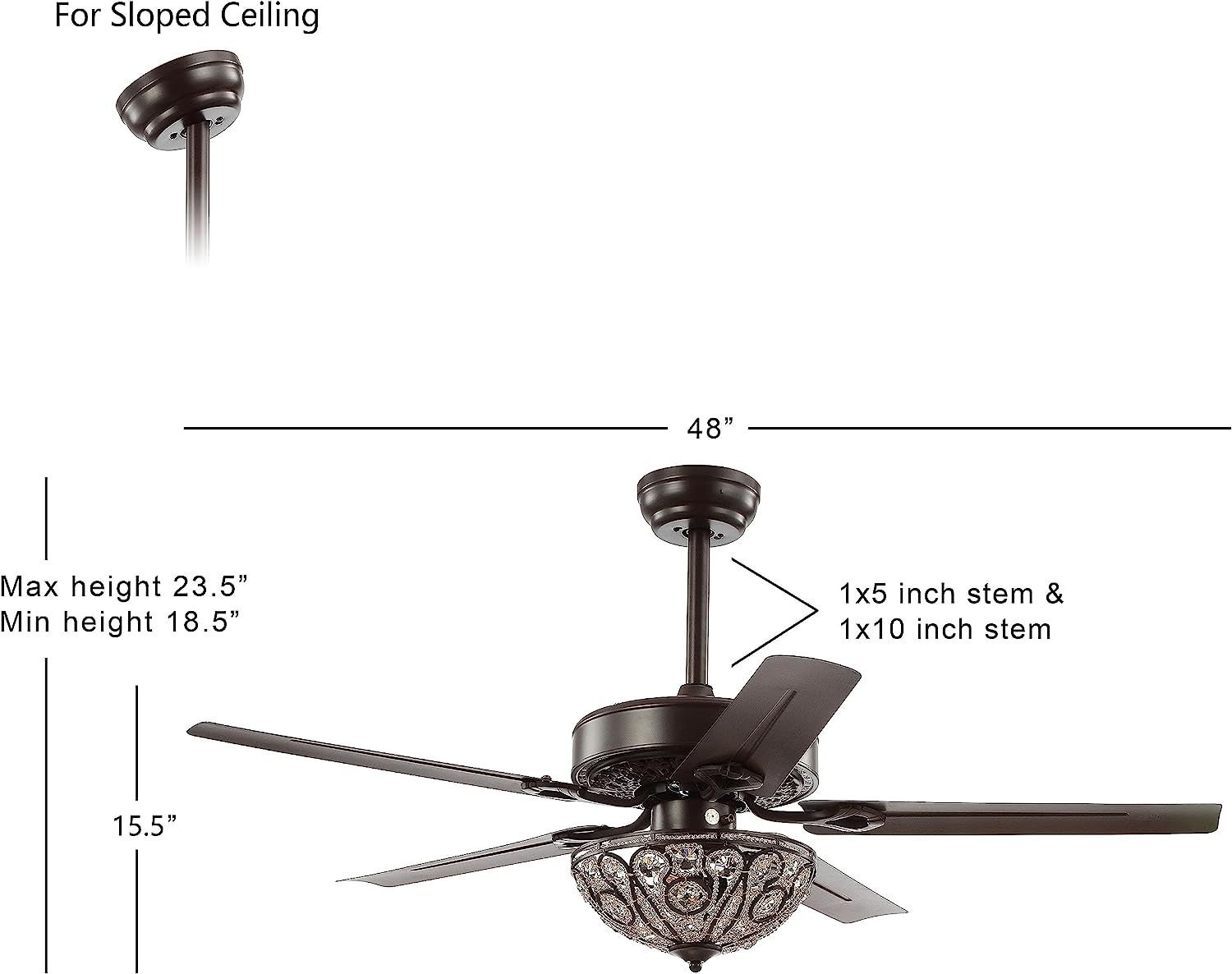 Product DetailsBlending rustic style with old world charm, our 48" Oil Bronze Fan features a gorgeous wrought iron overhead light with crystal drops. Five reversible blades generate ample airflow with remote control. Three LED bulbs provide bright, sparkling light.The clip can be adjusted to your desired lengthIncludes eco-friendly 9-watt bulbRequires 3 bulbs and is compatible with any 9W LED or 40W Type "A" or 13W CFLLight fixtures must be hardwired, we recommend a professional electrician to manage the installationAssembled Dimensions: 18.5-23.5"H x 48"W x 48"DShade: 4"H x 11.5"W x 11.5"DColor: Oil Rubbed Bronze, TransparentBody Material: IronBase Material: IronMax Wattage: 9W LED or 40W Type "A" or 13W CFLIncludes 1 ceiling fanNeed to assemble420 lumens