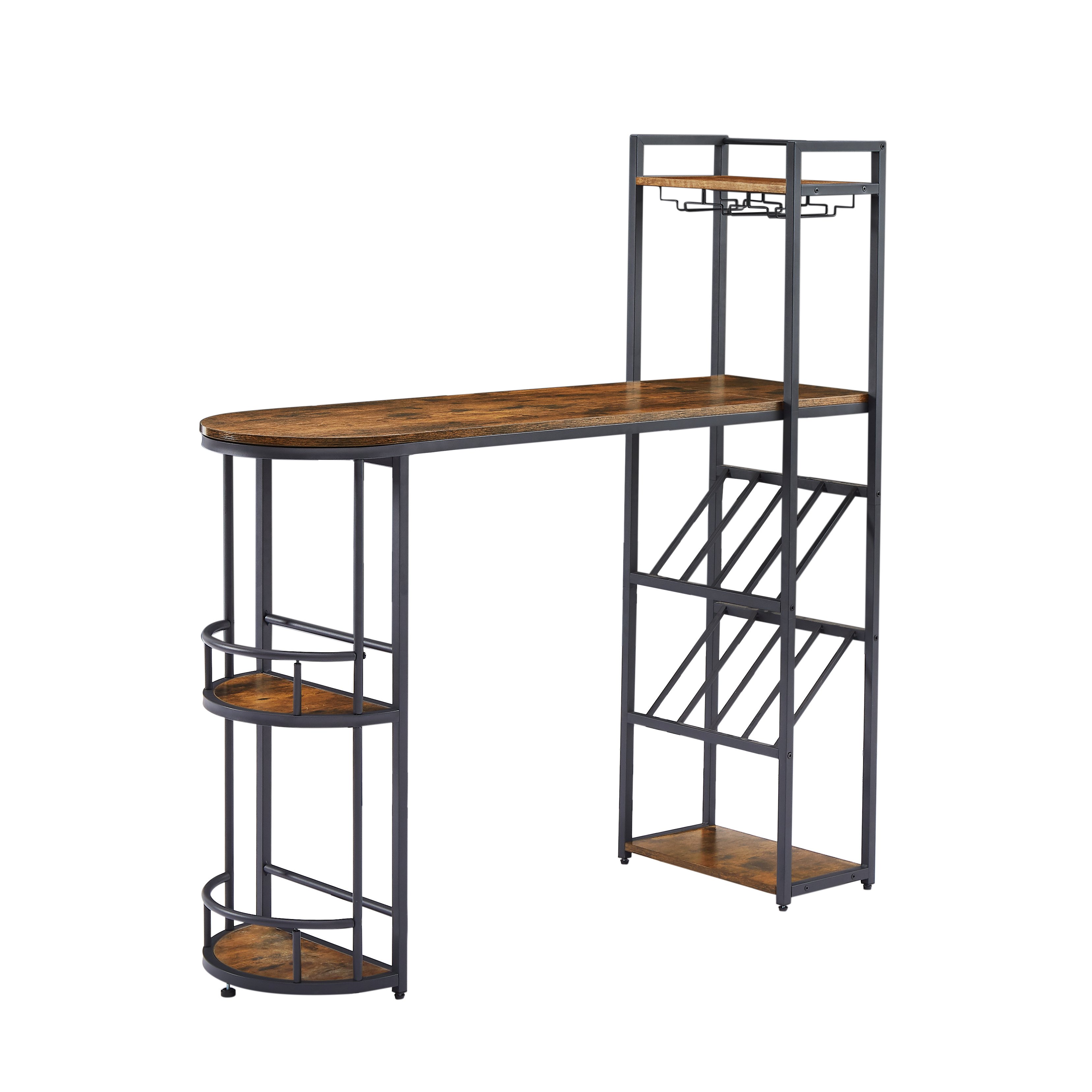 Bar table with bottle holder and glass holder; multifunctional high bar table; can hold 8 bottles of wine and 9 glasses; with side storage.(Rustic Brown; 53.3''w x 15.75''d x 36.4''h)Package Contents1 x Bar Table1 x Assembly Kit1 x InstructionsProduct Description•Multifunctional bar table; this table provides you with an excellent dining or drinking place; you can use it for a drink; breakfast and afternoon tea.• This bar table features bottle holders; glass holders and side organizers; so you can keep your favorite beverages on the 8 bottle holders and keep everything organized.•The side storage table perfectly meets the daily storage needs; and is equipped with a fence; which can place various daily items; such as bowls; plates; cups; etc.; without slipping off easily.• This is not only a bar table; but even a decorative piece; the rustic brown particle board and high-quality black iron frame create a simple style.•Suitable for kitchen; living room; dining room; patio; bar or office; can be used as bar table; breakfast bar; coffee bar; homework table; restaurant counter and more.• It can create a resting space anywhere in the home. Have a drink with family and friends; this will give you a relaxed atmosphere and a good time.