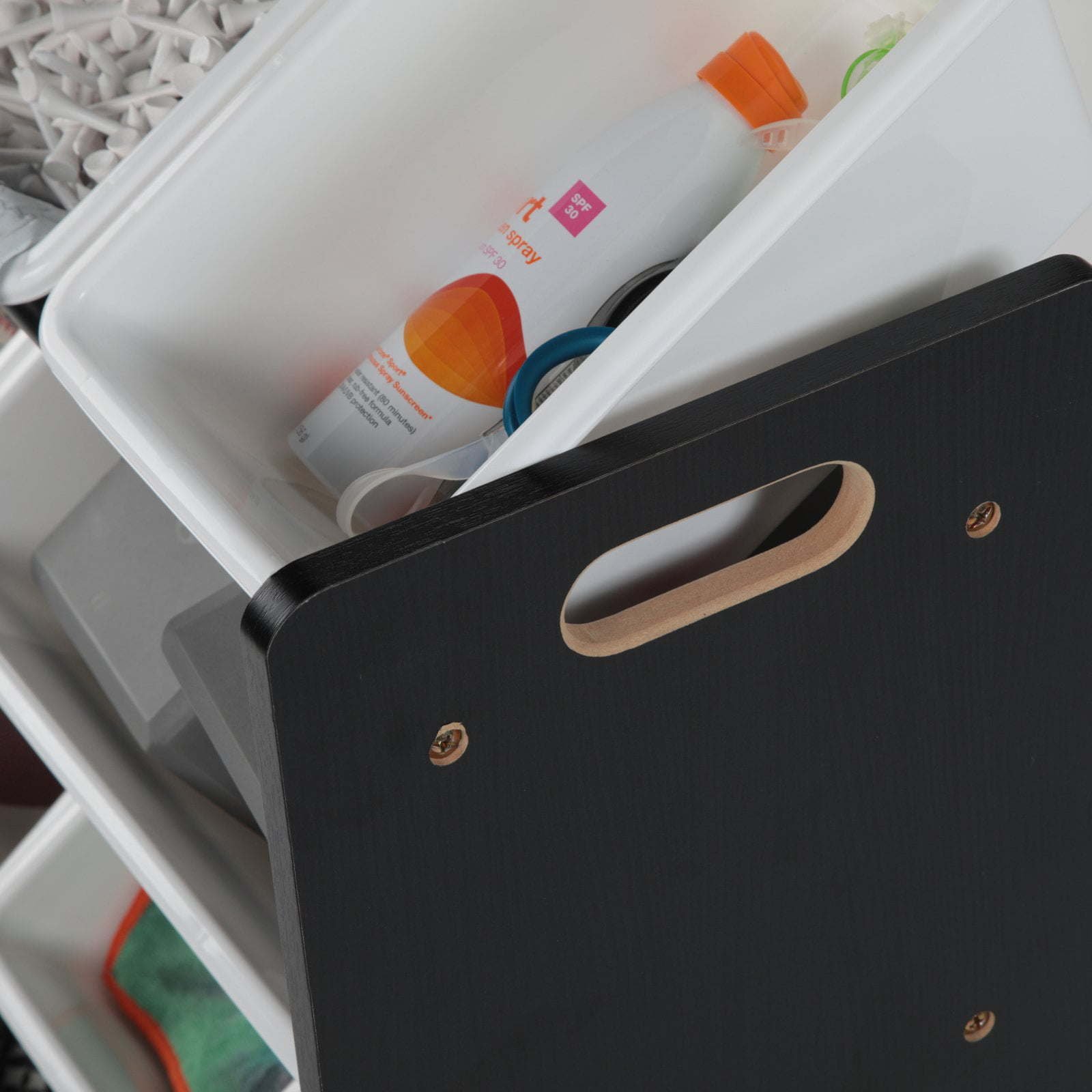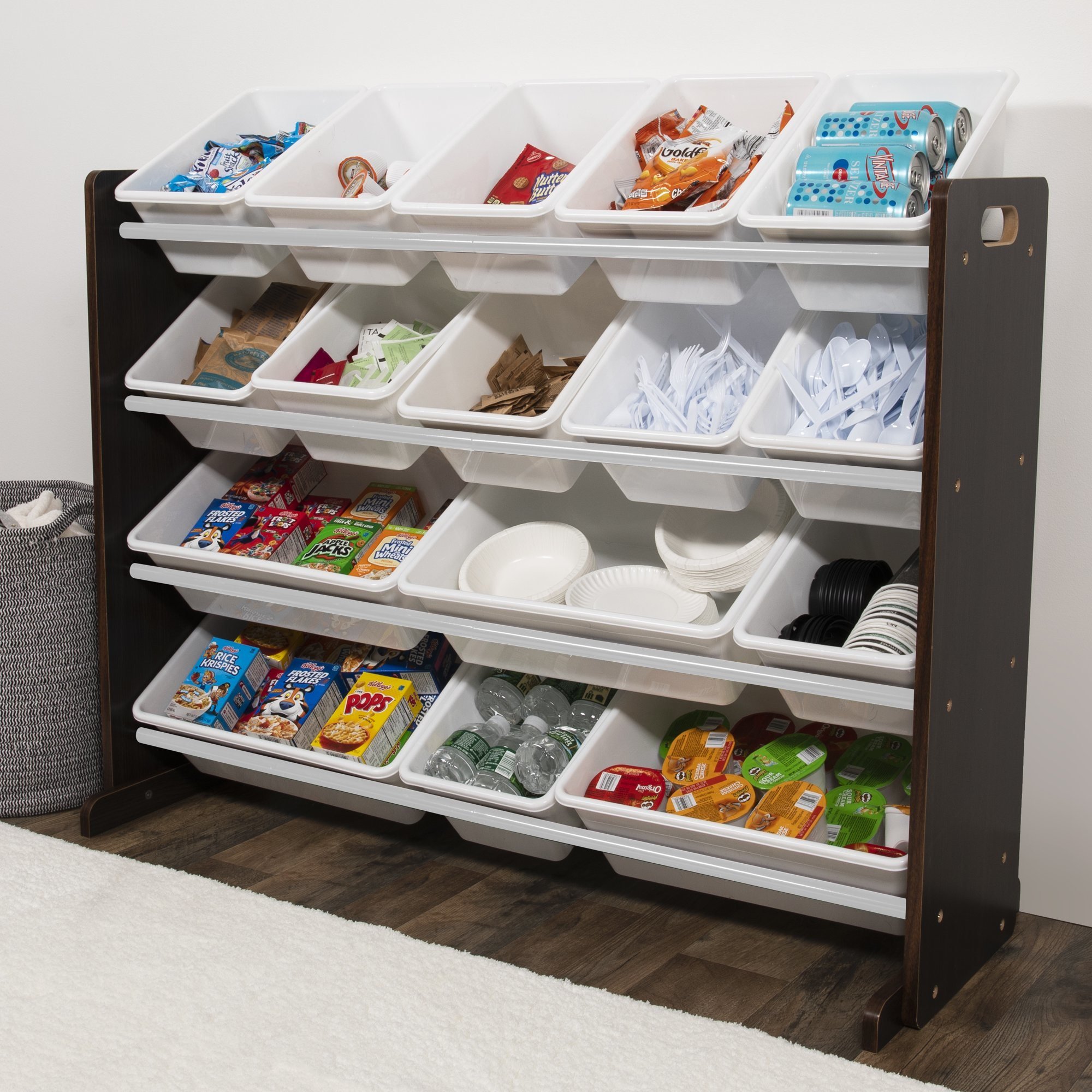 Playtime becomes more fun when your kids can easily take out their toys, books and games and then quickly clean up afterwards. The space-saving Tot Tutors Super Sized Toy Storage Organizer with 16 Storage Bins stows your children's toys in easy-to-see, easy-to-access BPA and phthalate free plastic storage bins. Ideal for organizing your child's nursery/bedroom, playroom, closet, living room. The options are endless. The 12 standard and 4 large colorful storage containers are easy to remove, replace and reposition along the 4 tiered organizer shelves. Storage bins are sized just right within the toy organizer for toddler and preschool aged children. Sturdy engineered wood construction frame with stabilizing braces and steel shelving rods, 20 pound weight capacity per level. Some assembly is required. A great toy storage box alternative; helping keep your little one's room clean and organized while at the same time teaching color identification, sorting and cognitive skills. Product sizing: 42"W x 11"D (15.5"D with stabilizing braces) x 32" H Standard bin sizing: 11.75" L x 8.25"W x 5.25" H Large bin sizing: 16"L x 11.75"W x 5.25"H Additional plastic storage toy bins are sold separately.