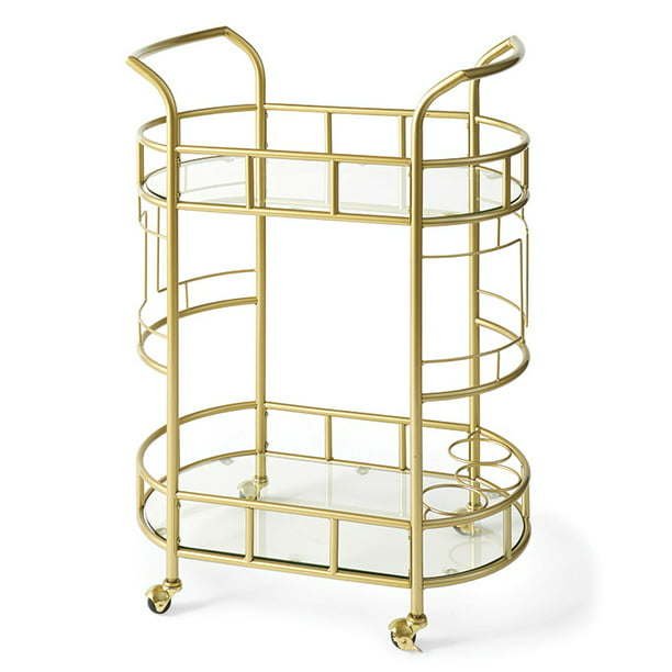 The Fitzgerald Metal 2-Tier Bar Cart, Matte Gold is the ideal way to serve your party guests in style. It has a tasteful, transitional style and features rolling casters. This Better Homes & Gardens bar cart comes in a matte, brushed gold metal finish that will add a touch of elegance to any space. Pair it with a classic glass tier base to make it a uniquely versatile addition to your home, apartment, or office space. This bar serving cart boasts a sturdy, open design that creates easy storage for bottles, glasses, or utensils of any height and size. It also features three built-in wine bottle holders for safe and easy transport. While the Fitzgerald holds plenty of space for storage it is also compact and the perfect size for any home, office, or apartment.