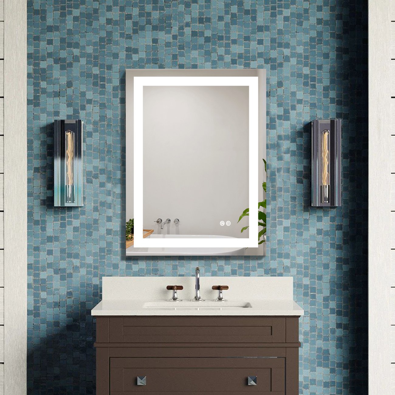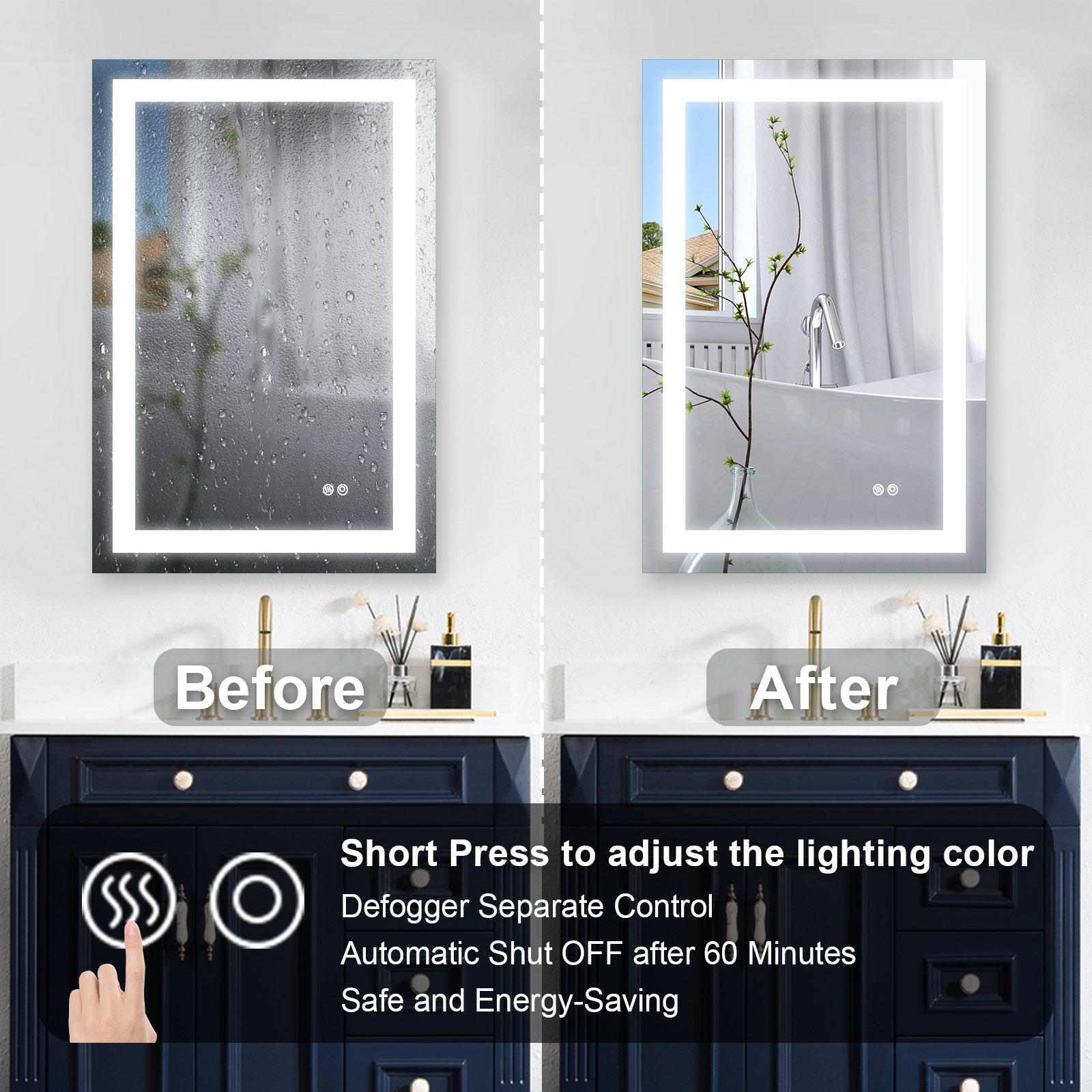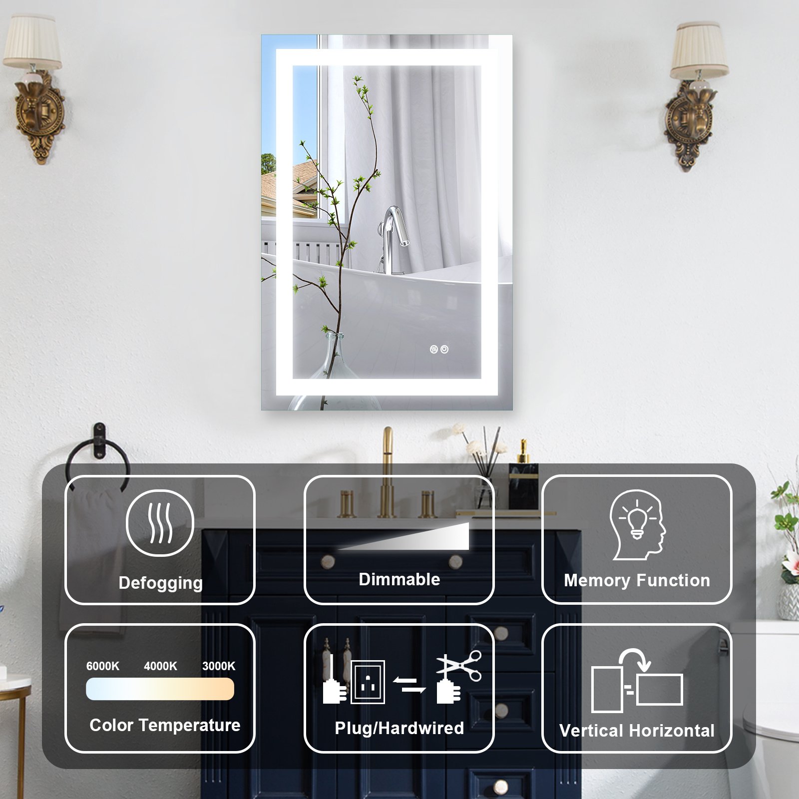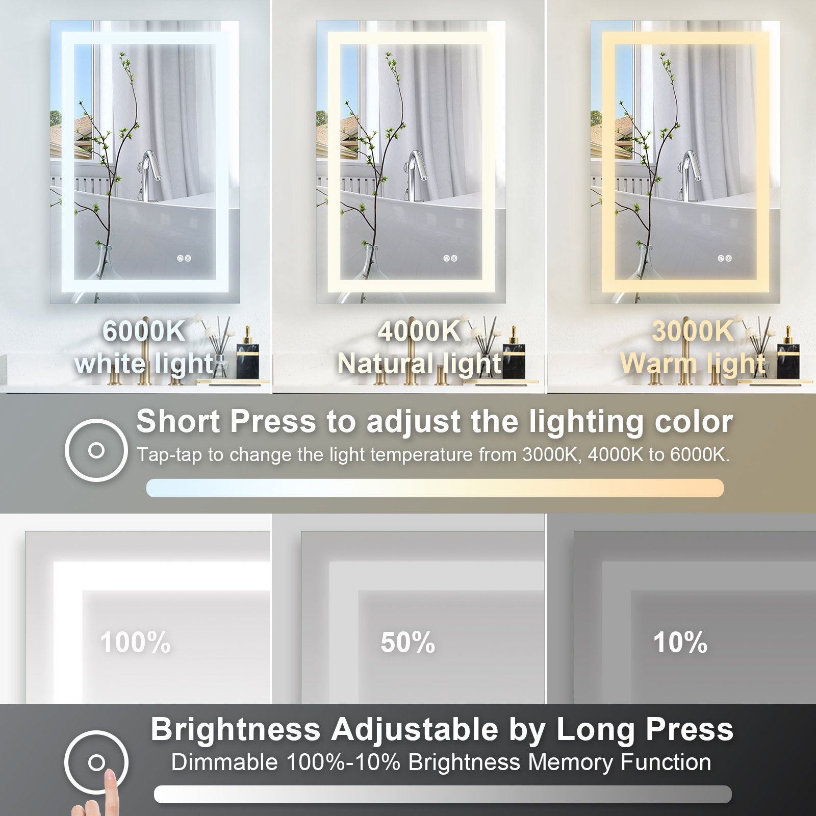 The bathroom mirror with LED light; Made of high qualit Anodized aluminum can be used for long time. High tech Intelligent bathroom vanity makeup mirror with defogging function. Touch sensor button can adjustable mirror color brightness from 2700K-6300K to meet the needs of different light. Brightness can be adjusted freely from 10 % to 100%. Large size bathroom mirrors wall mounted design; it is space-saving. Bright mirror can make your bathroom or living room can be more spacious; Better mood. Perfect for bathroom; bedroom; dressroom; powder room and more.