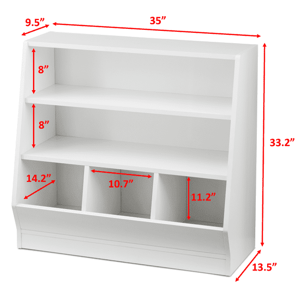 The Kids Bin Storage and Bookcase provides a place for your little ones to keep their toys and books and is a delightful addition to any playroom, family room, den, and more. The bookshelf features two shelves and three open storage bins at the bottom, creating a great opportunity to teach youngsters how to pick up after themselves and organize their books and belongings. This storage unit can support up to 24.2 pounds on the top panel, 22 pounds on the upper shelf, 33 pounds on the lower shelf, and 33 pounds on the bottom panel. The Your Zone Bin Storage and Bookcase is easy to assemble and features a flared base design and wall attachment strap for added stability.