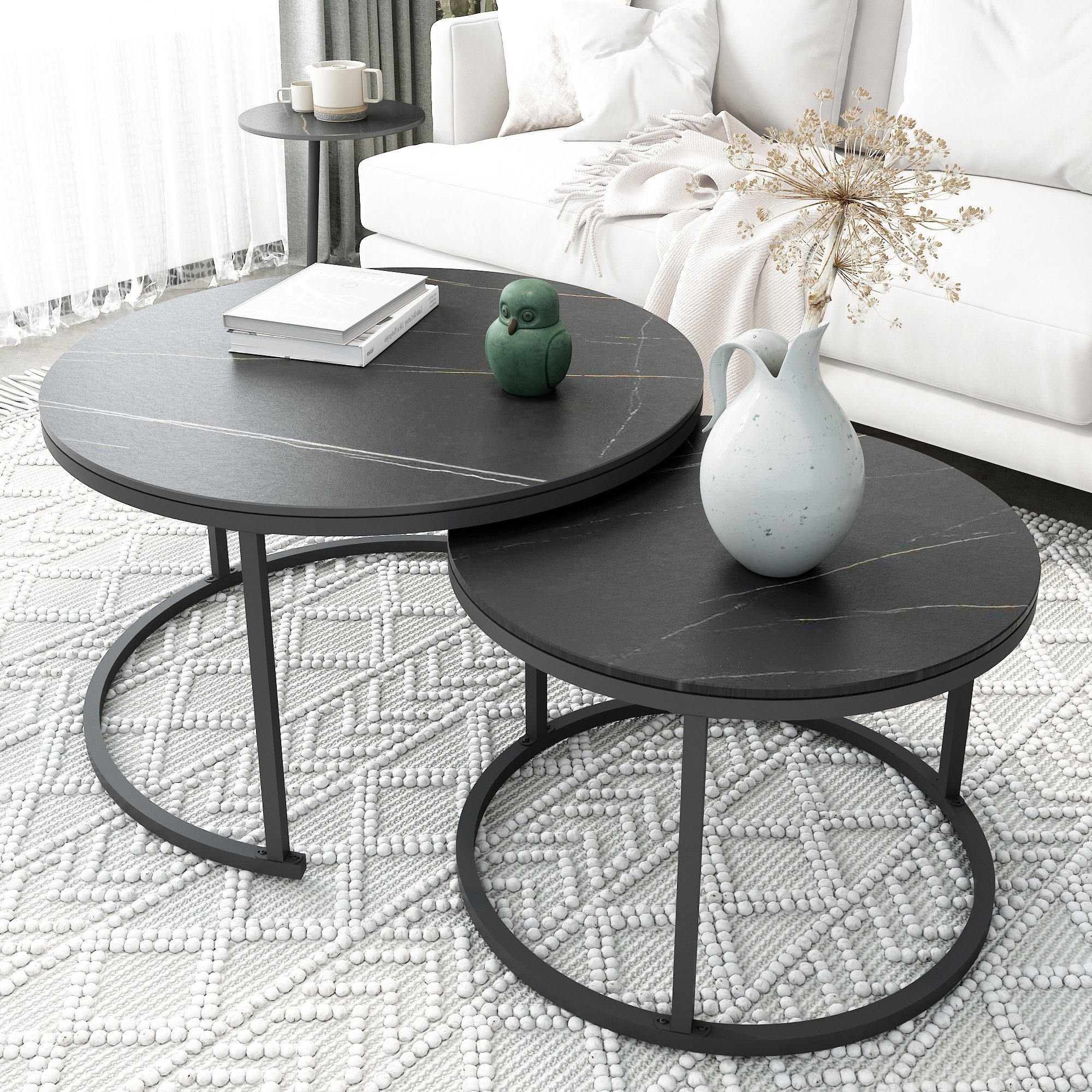 Modern Round Nesting Coffee Table Set of 2 with Black Faux Marble Top,Metal Frame - Black