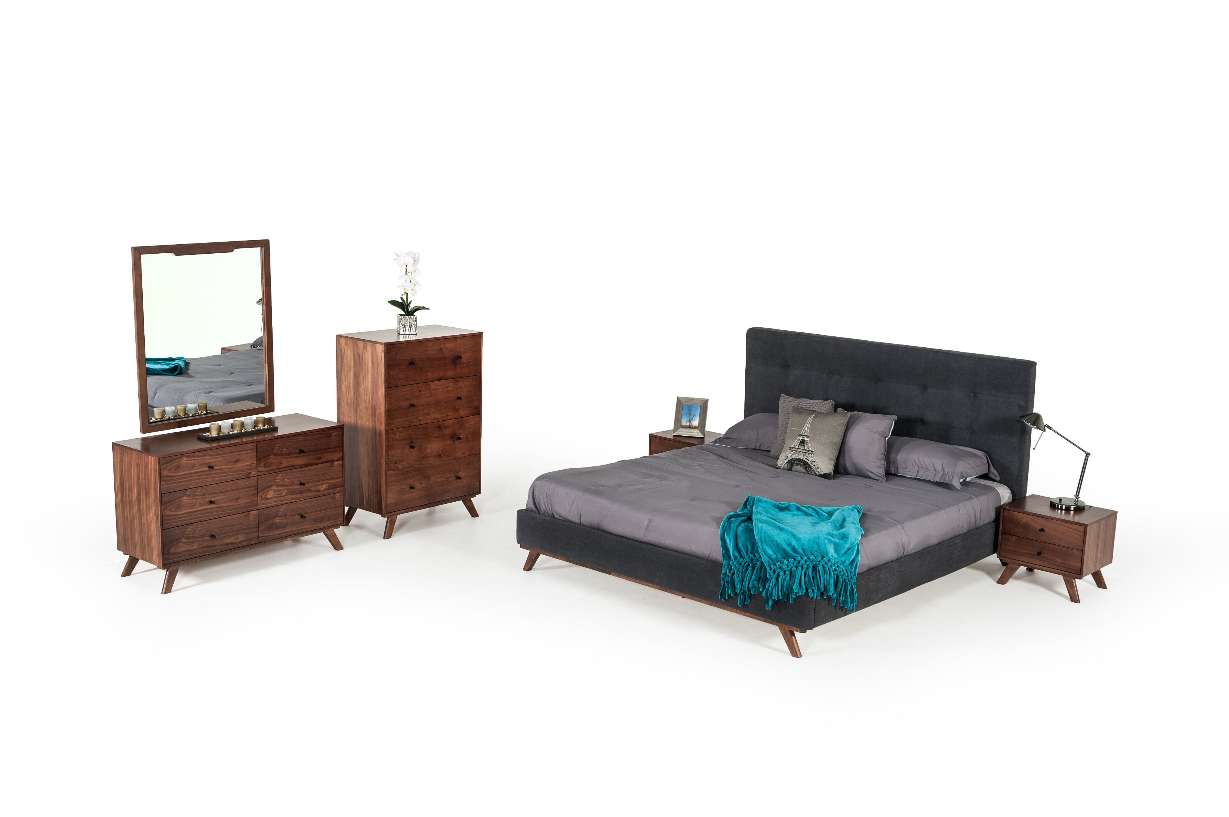 Addressing your storage needs is the Modrest Addison Mid-Century Modern Walnut Dresser featuring a shiny Walnut Veneer finish. Six equal-sized drawers give you ample space to keep your shirts, dress accessories, as well as bed items. The wood markings on the surface made this dresser even more appealing. Protruding dark Walnut pulls gave it a different look. This modern dresser gets sturdy support from conical Walnut finished solid Rubberwood legs.Features:Walnut Veneer Finish. 6 Drawers. Walnut Finished Solid Rubberwood Legs. Legs Require Assembly. Dresser Weight Capacity: 220 lbs.