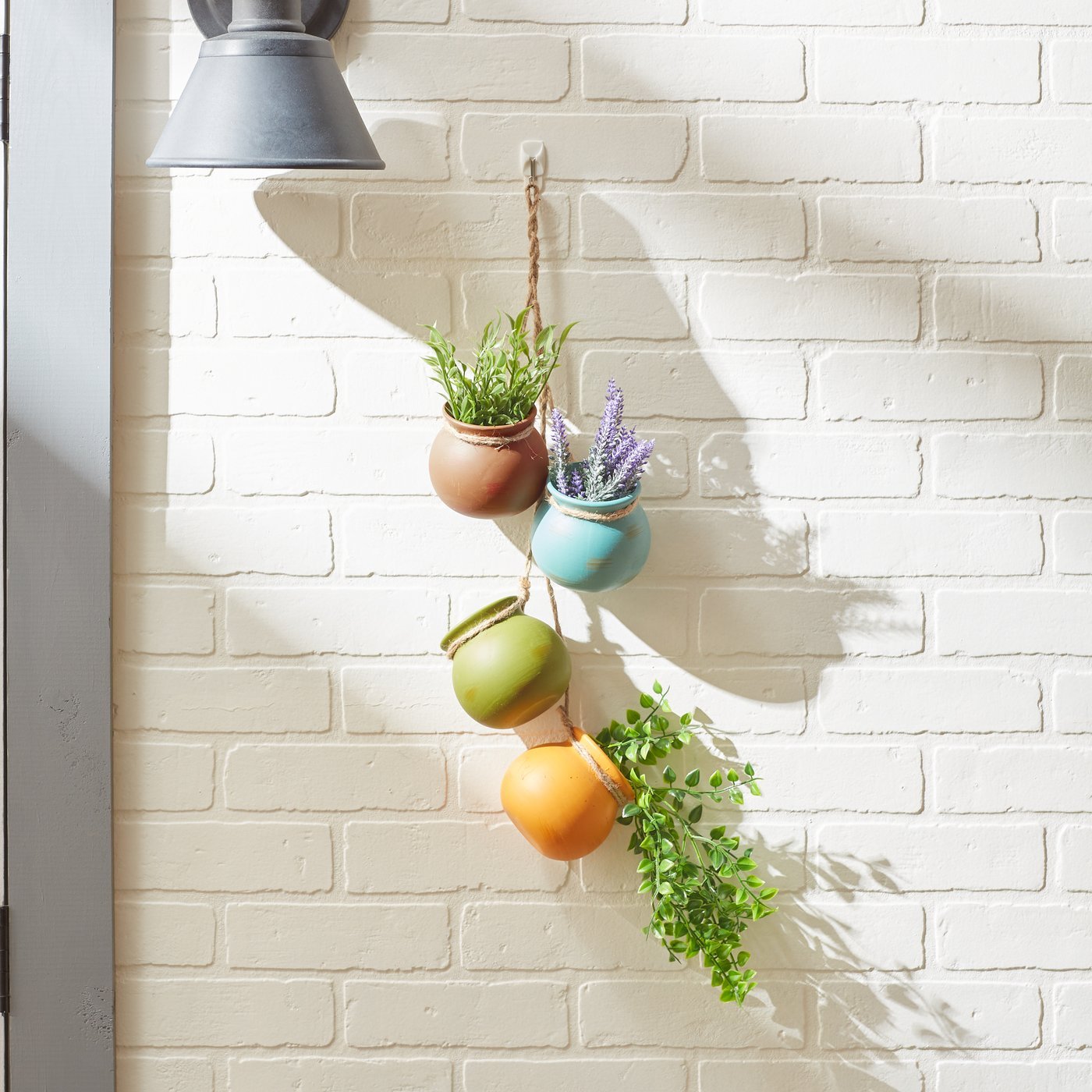 A cheerful kitchen display in Southwestern style colors. Four ceramic pots dangle from a jute hanging rope to add style to any corner! Weight 1.9 pounds. Ceramic with jute hanger. 3.75 inches in diameter x 23 inches long.