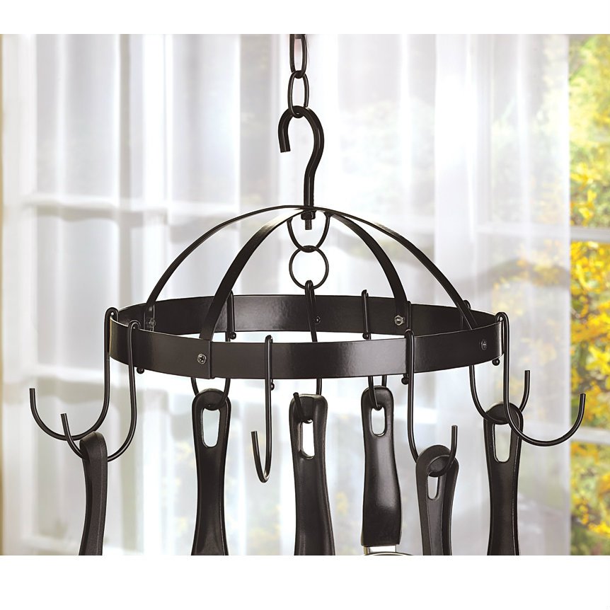 You can still have the gourmet look, even in a smaller kitchen, with this space-saving pot hanger. Hang utensils or pots and pans, even in a small corner of the space. Eight hooks. Intended for smaller items with a maximum weight limit of 4.4 pounds. Weight 2.2 pounds. Metal. 17.25 x 17.5 x 10.5 inches tall.