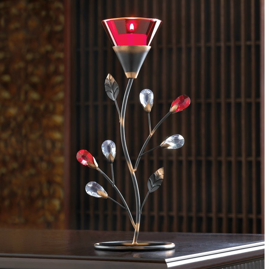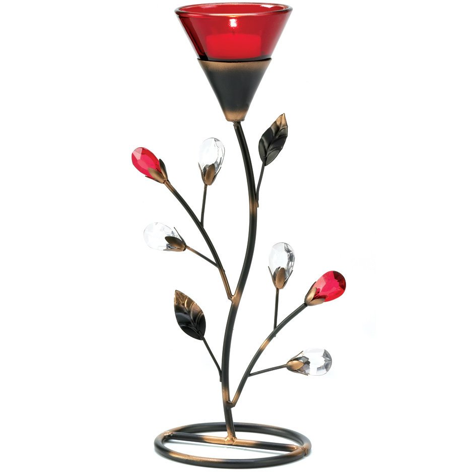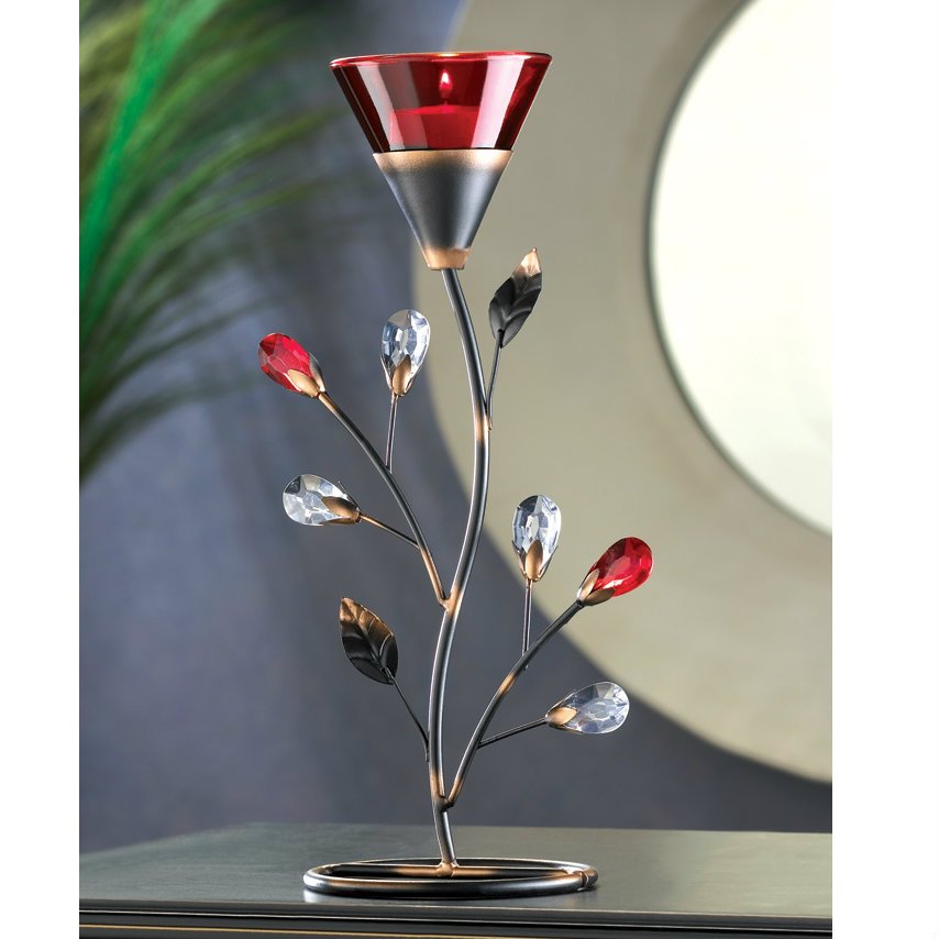 Why give a flower, when you can give this beautiful candle holder that will last forever? Cone-shaped candle cup is a dramatic, romantic red, and the little buds are red and clear. Metal base adds interest with its multi-tone quality. Weight 0.6 pound. 6 x 4 x 11.25 inches tall. Iron, glass and acrylic. Candle not included.
