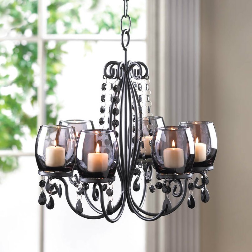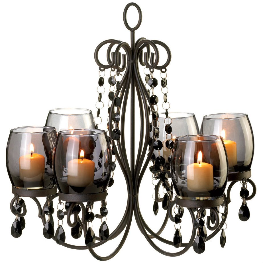 The dark tones and smoky glass candle cups give this hanging candle chandelier a sultry look. The facets in the dangling beads reflect the candle light beautifully. Weight 5.7 pounds. 13.5 x 12.1 x 14 inches tall . Iron and glass with and acrylic beads . Chain and candles not included.