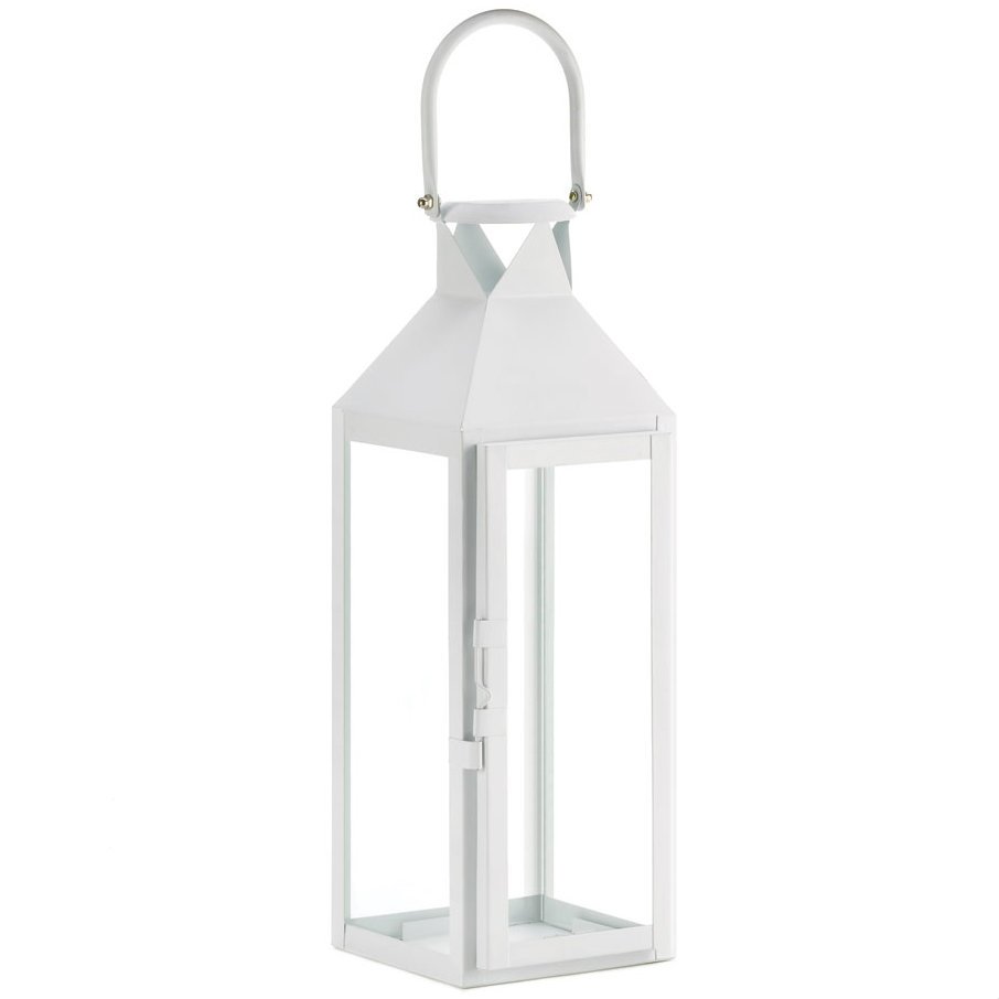 A simple design with a contemporary look. Clear glass panels with a white metal frame. Triangle cutouts around the top. The handle can be used as a hanging loop. Weight 3.1 pounds. 5.5 x 5 x 15.25 inches tall. 18.5 inches tall with handle extended. Candle not included.