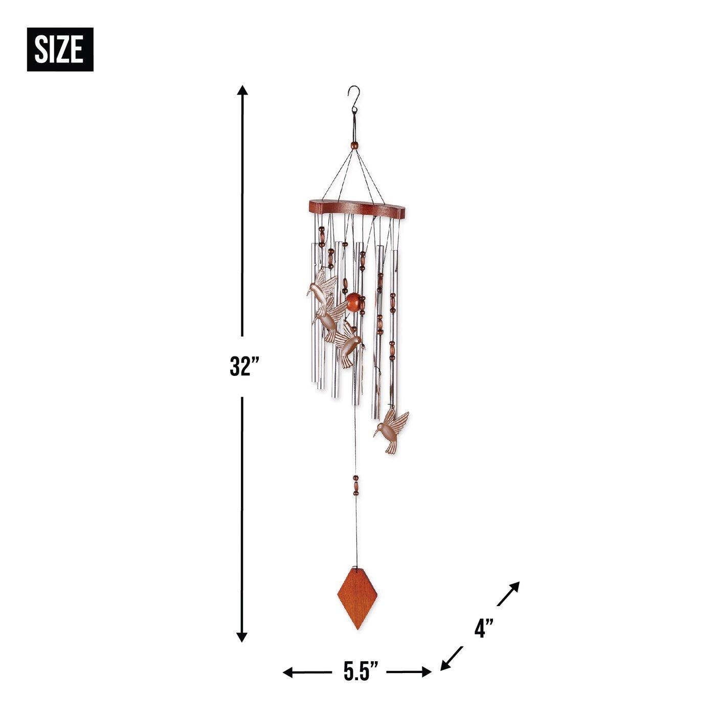 Beautiful set of windchimes with hummingbirds set at different heights. Wooden accents, beads, and metal chimes. The top piece of wood is shaped like a crescent moon. Weight 0.4 pound. 5.5 x 4 x 32 inches long. Aluminum and wood.