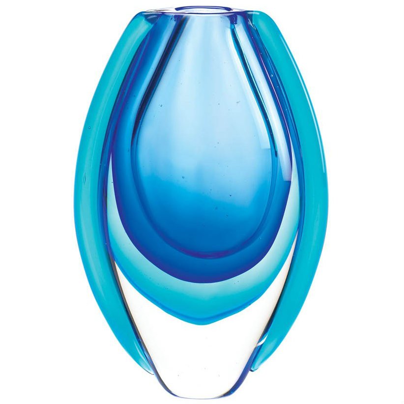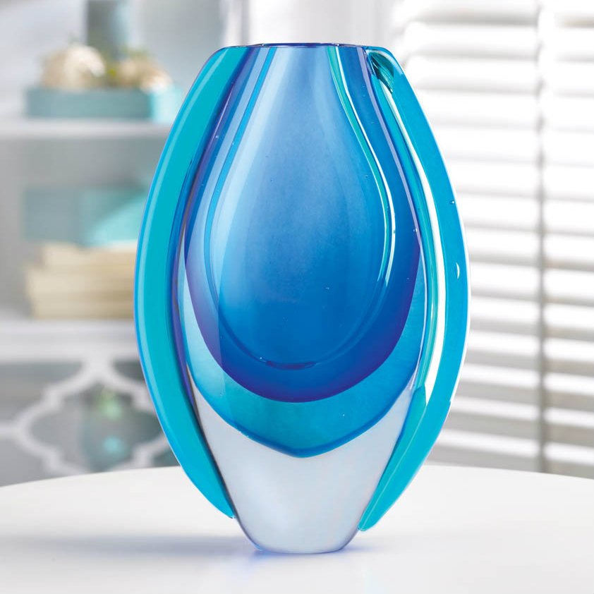 Art glass vase features gorgeous shades of blue, reminiscent of the sea. This piece is stunning when set near a window to capture the sunlight. 5.5 pounds. 5.5 x 2.5 x 8.5 inches tall. Glass.