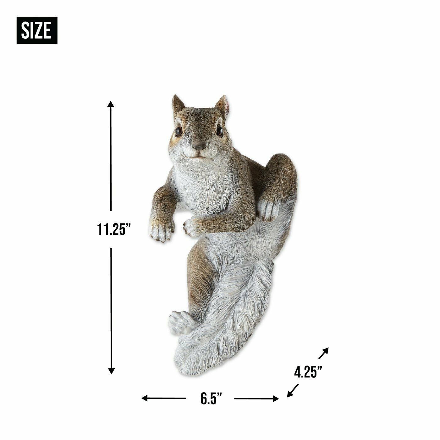 Little Chip the squirrel will look adorable hanging over a fence, the side of a potted plant, or anywhere that could use a dash of cuteness! 1.6 pounds. 6.5 x 4.25 x 11.2 inches tall. Polyresin.