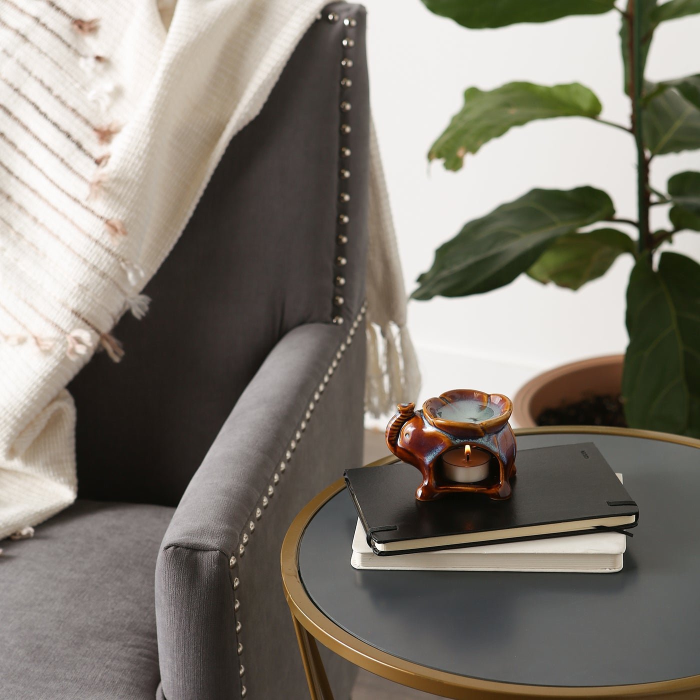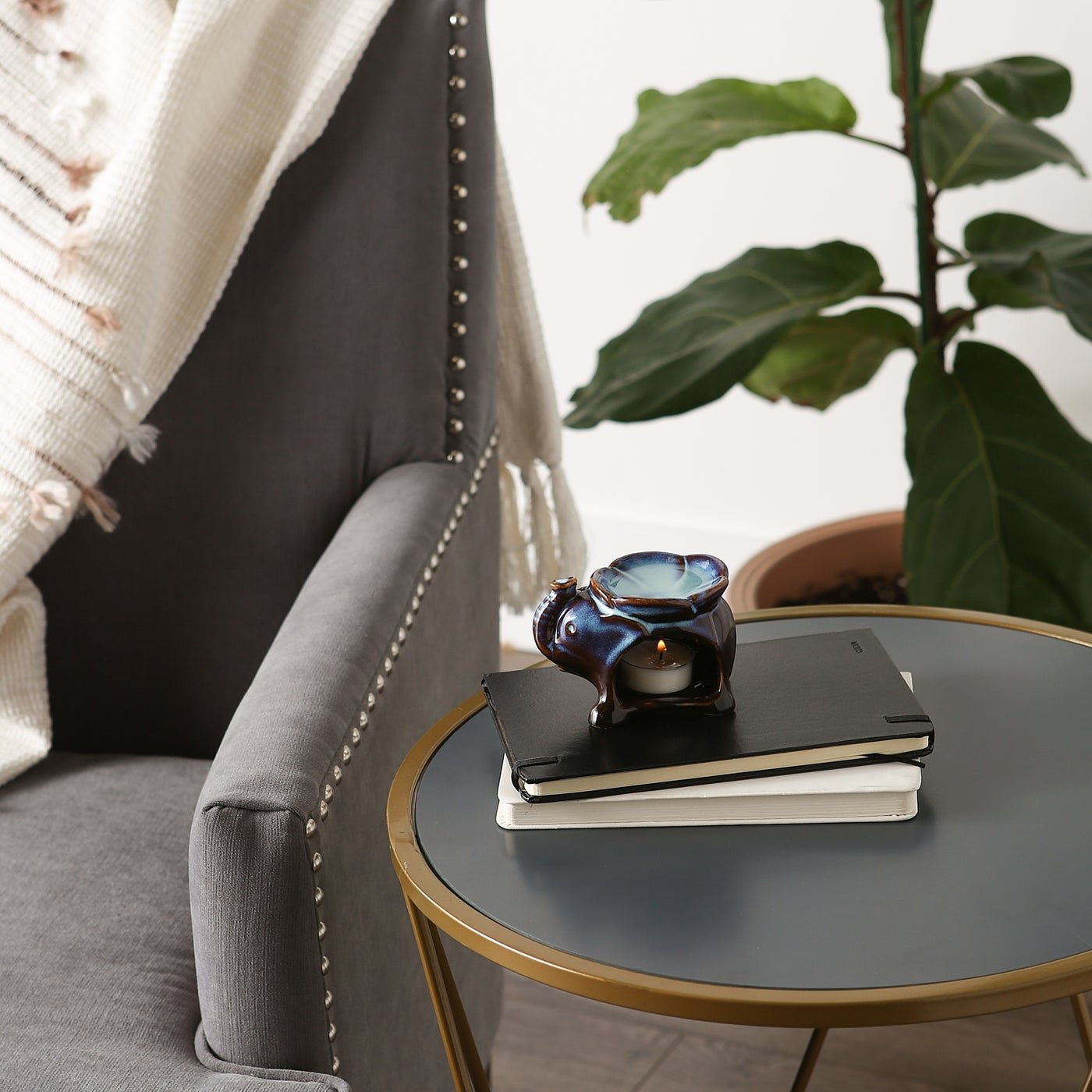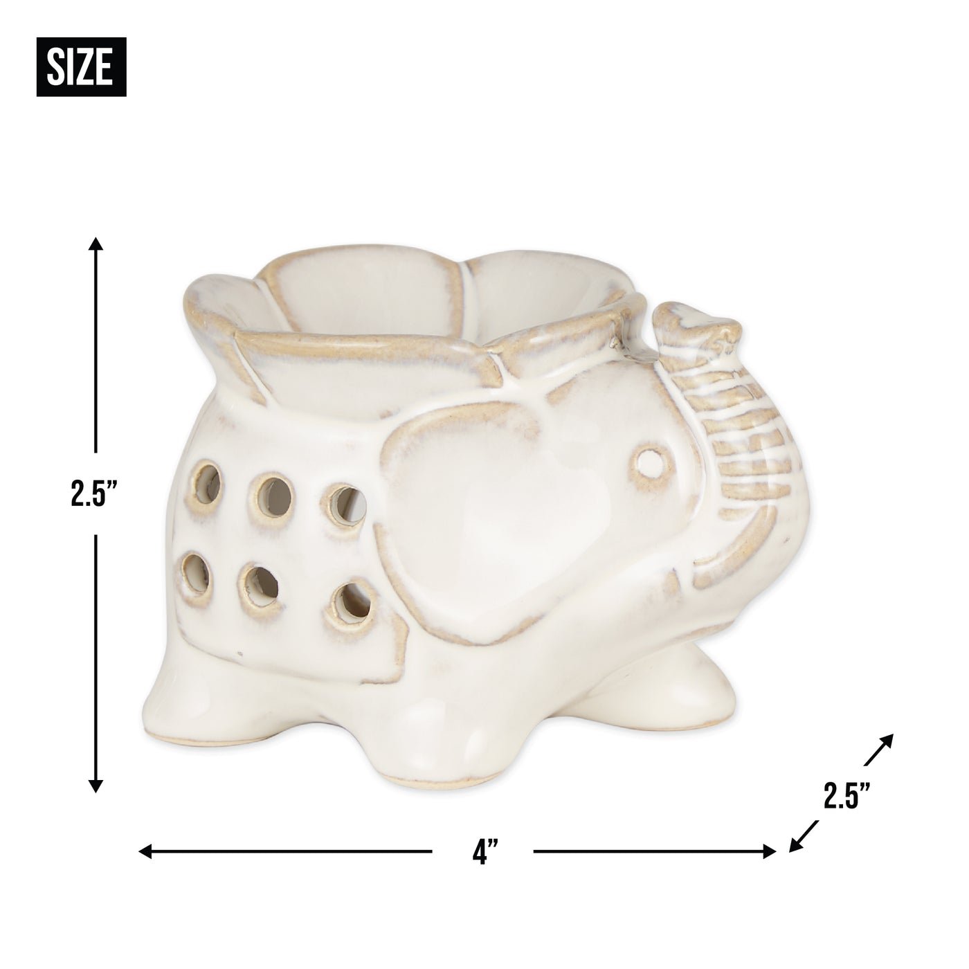 Set of three porcelain elephant oil warmers in three gorgeous colors. The basin on top holds the oil, and a tealight candle sits in the base. Weight of set 1.6 pounds. Each: 4 x 2.5 x 2.5 inches tall. Porcelain. Oil/candles not included.