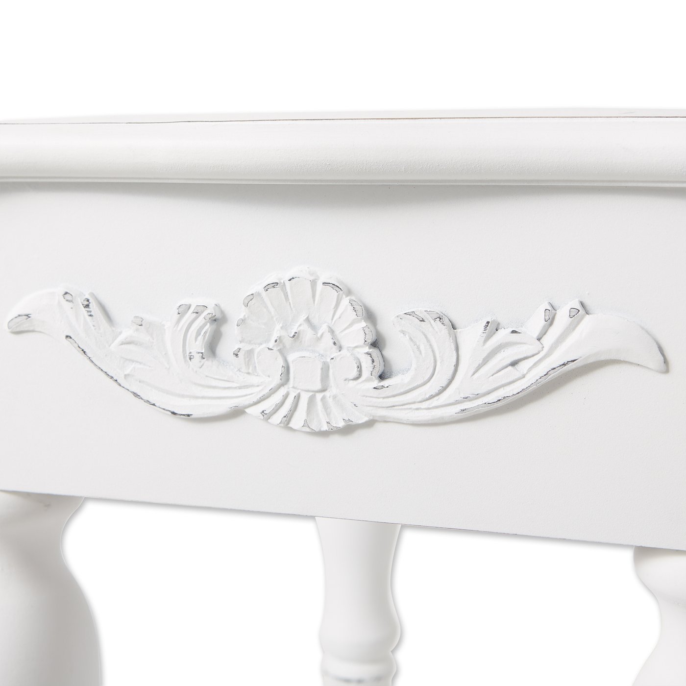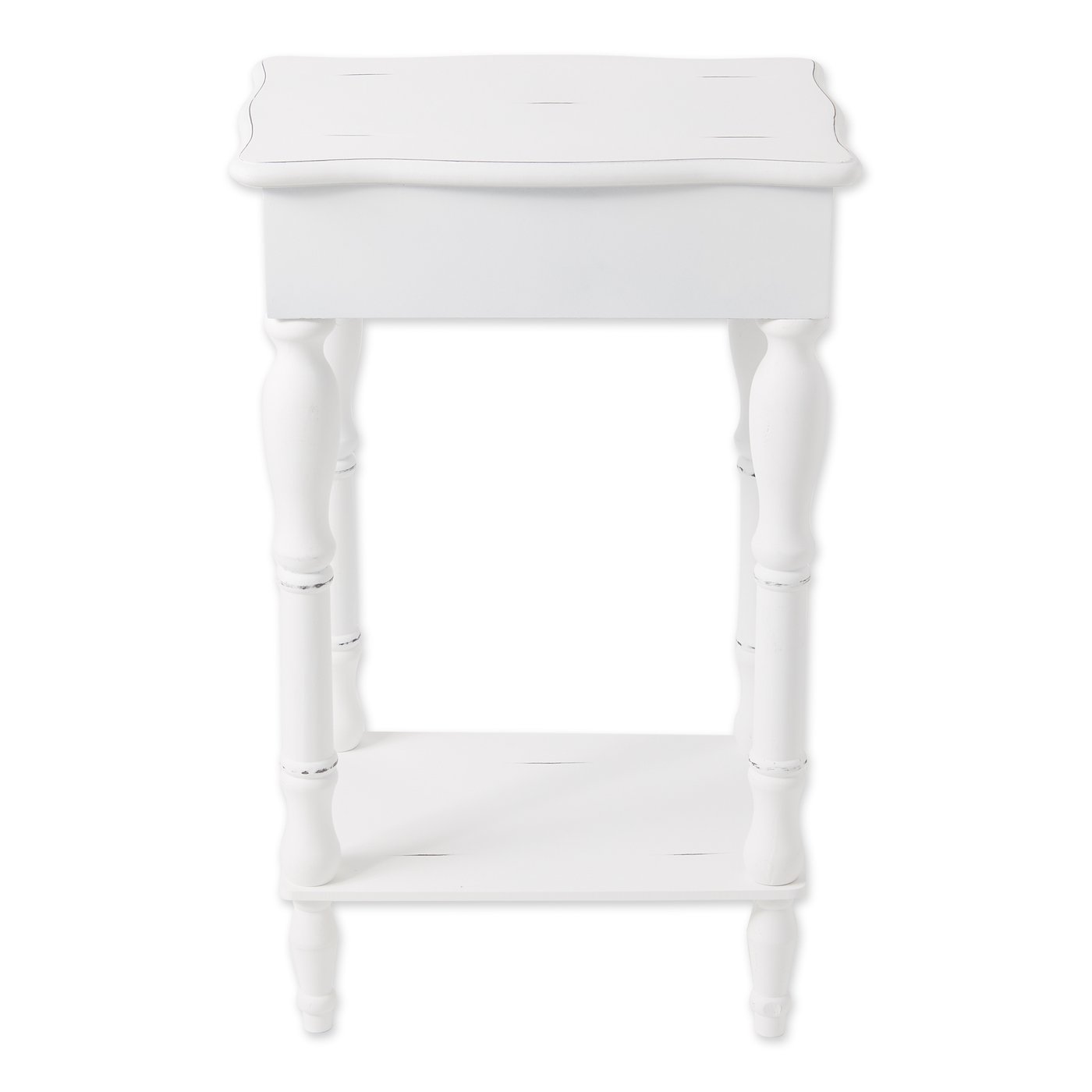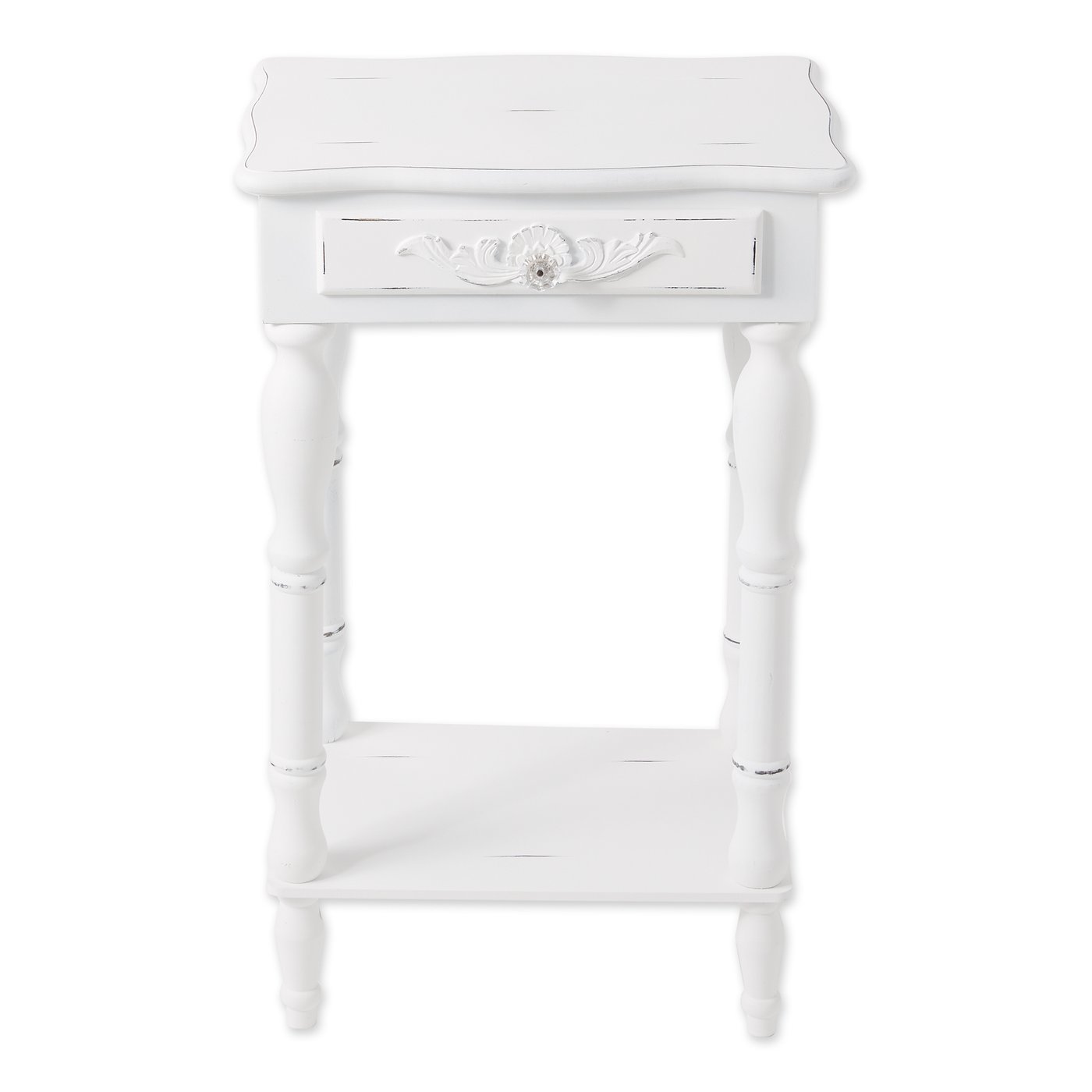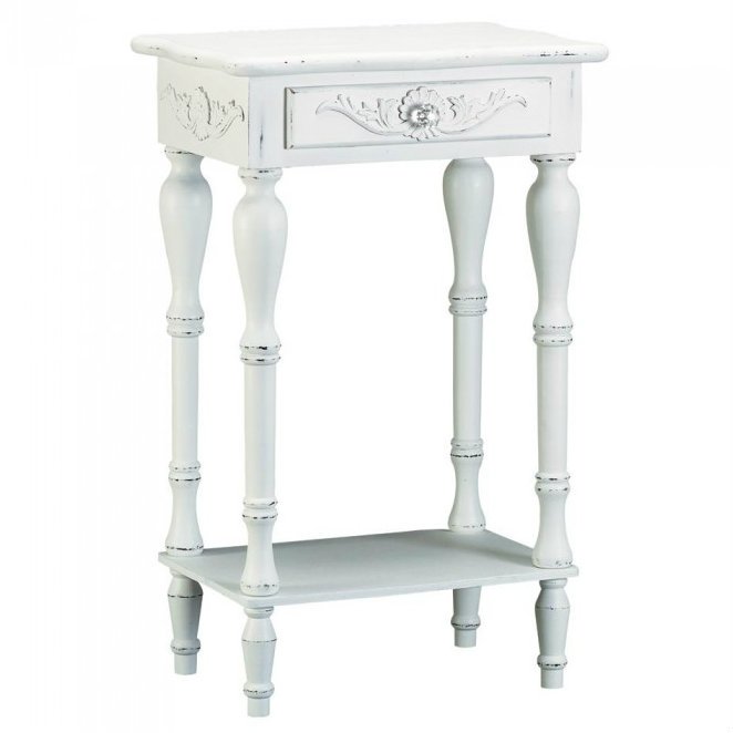 Shaped legs and shell-design trim add distinction to this decorative side table. A generous drawer and a bottom shelf provide plentiful storage. Distressed look will vary. Allow for inconsistency on final finish on each table. 12 pounds. 17.8 x 13 x 28 inches. Pine wood and MDF wood.
