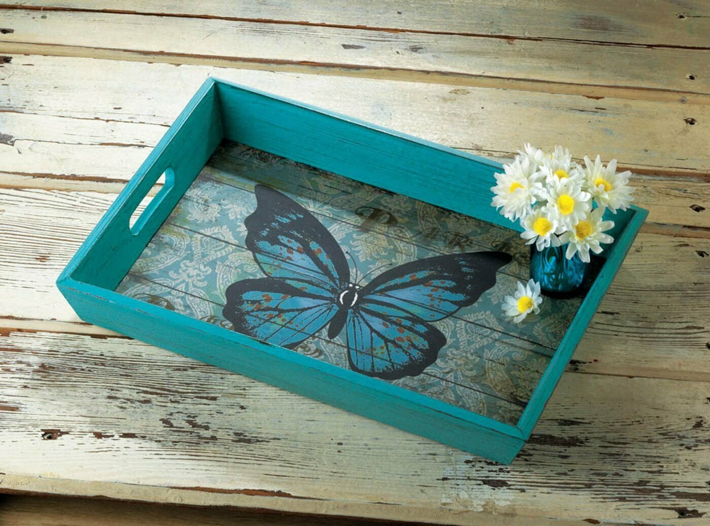 Pretty wooden tray features a weathered finish and a blue butterfly design. The walls of the tray are finished in blue and feature easy-grip cutout handles. Also can be used as a beautiful display for jewelry or decor items, or just by itself. 1.2 pounds. 16 x 12.2 x 2 inches tall. Fir wood and MDF wood.