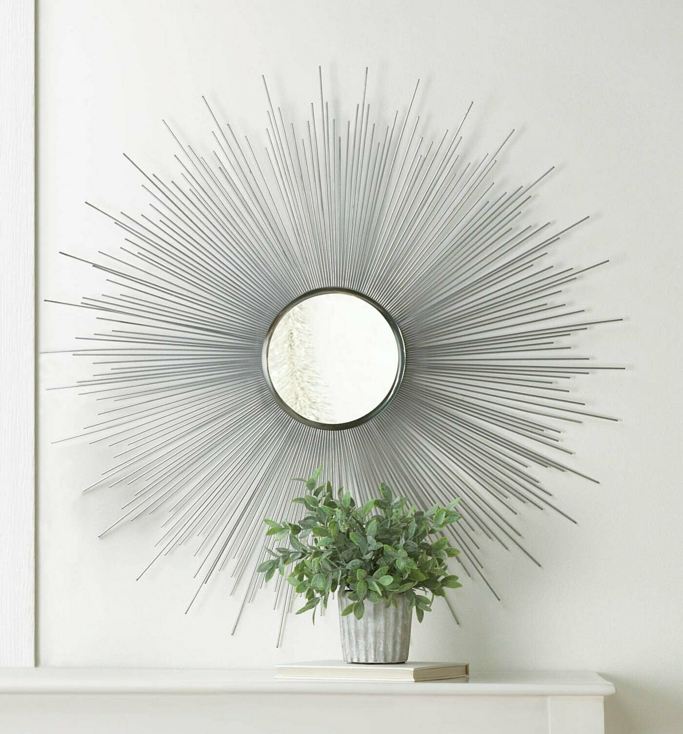 A beveled mirror makes a bold statement with long, silver iron rays spraying in all direction, with just a touch of vintage style. Metal has a matte silver finish. Stunning in a hallway or foyer. 7.5 pounds. Iron design with inset mirror. 33 inches in diameter. Mirror is 8 inches in diameter.