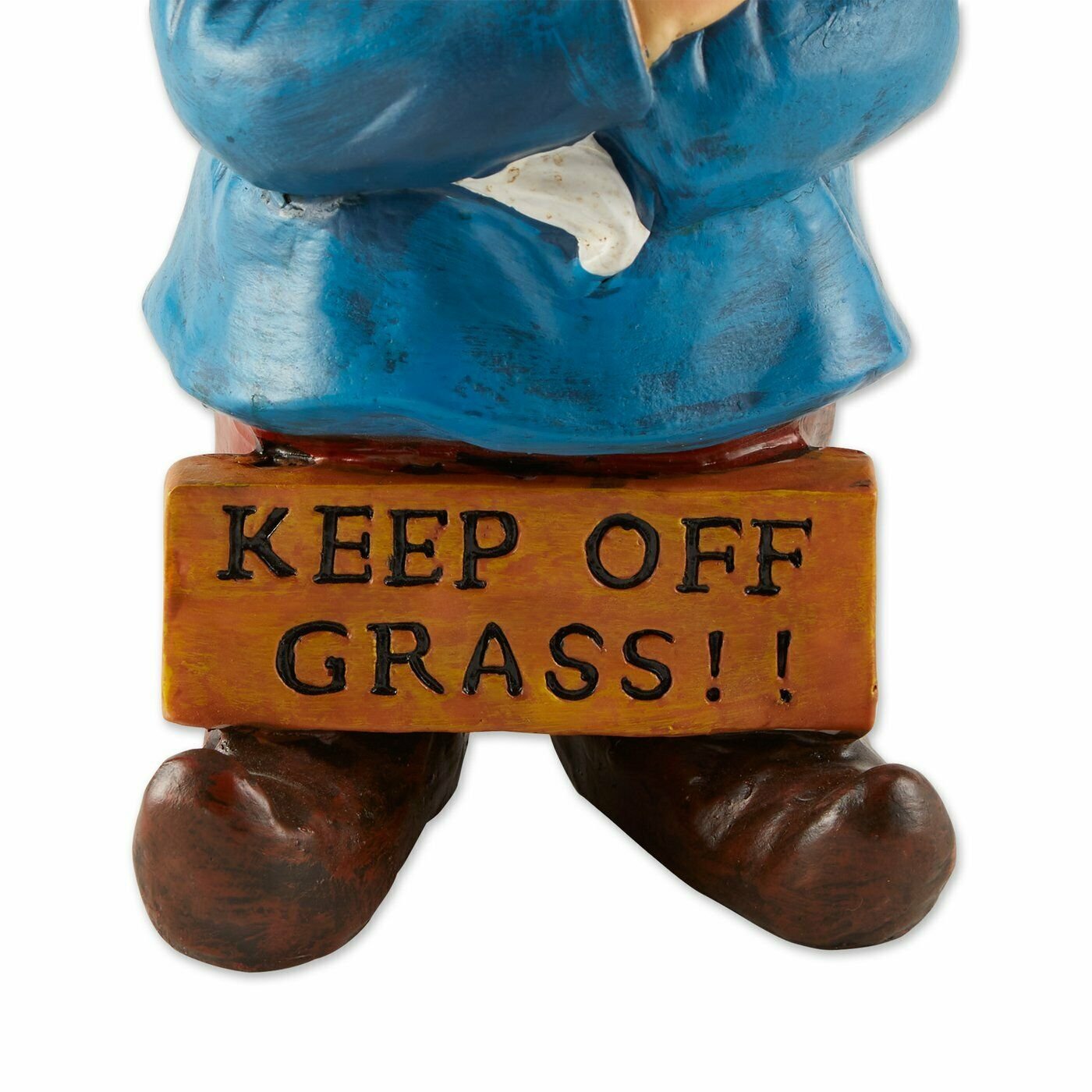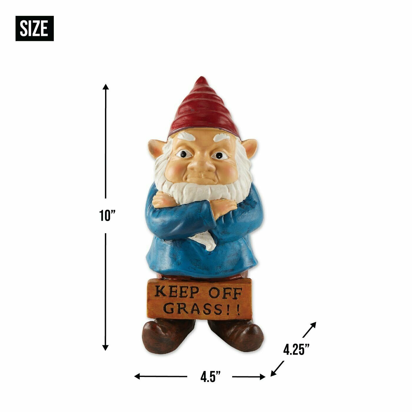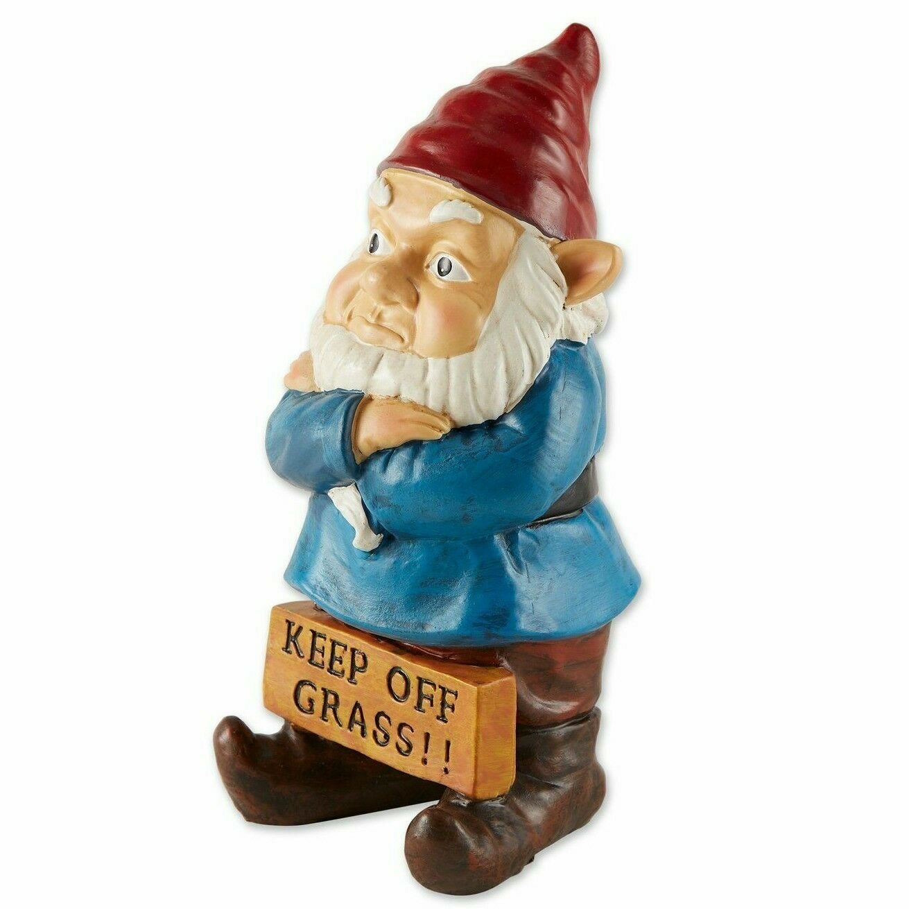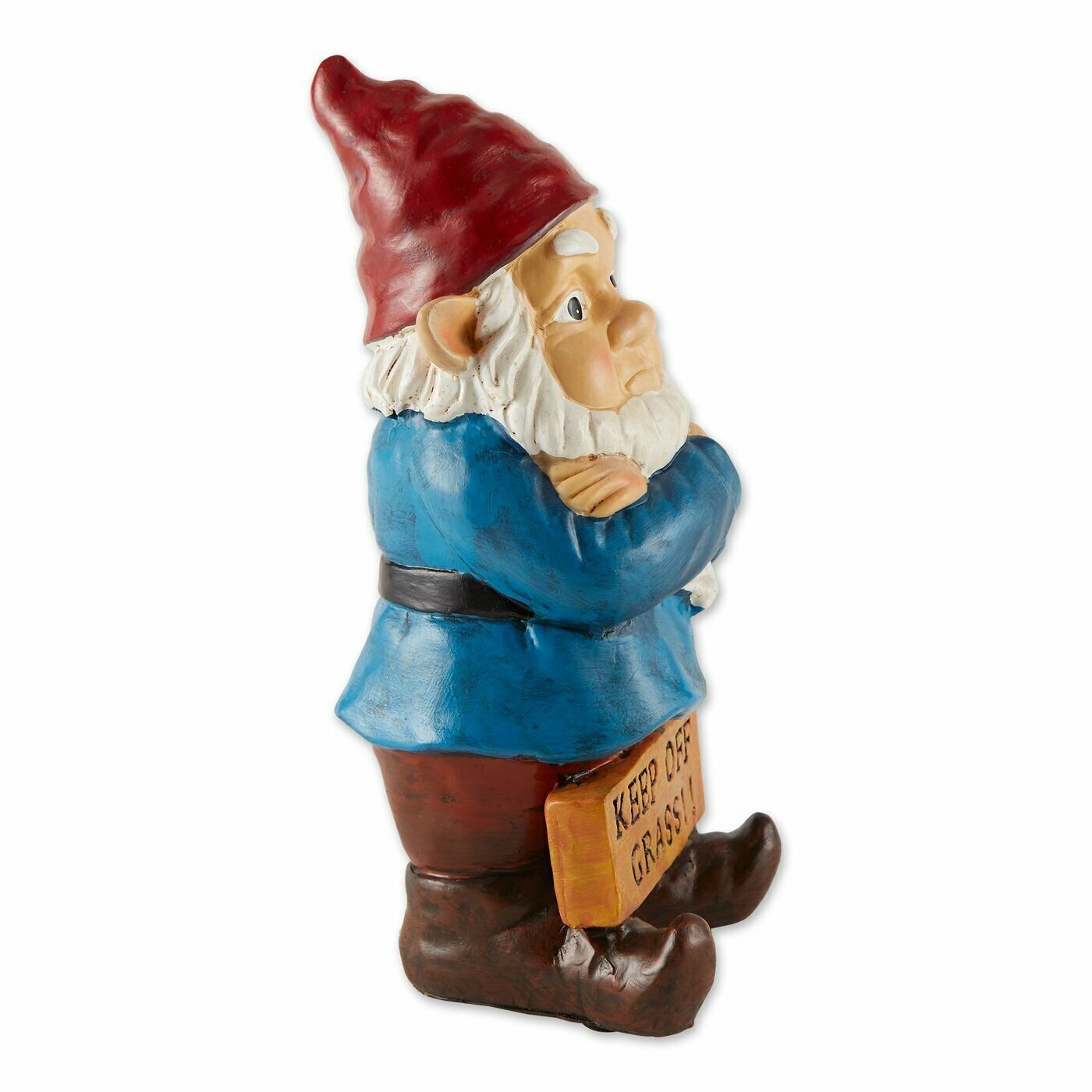 Don't cross this gnome! He's got a grumpy look and a sign that reads "Keep Off Grass!!" A funny and charming way to let folks know they need to stay clear of the yard. 1.6 pounds. 4.25 x 4.25 x 10 inches tall. Polyresin.