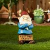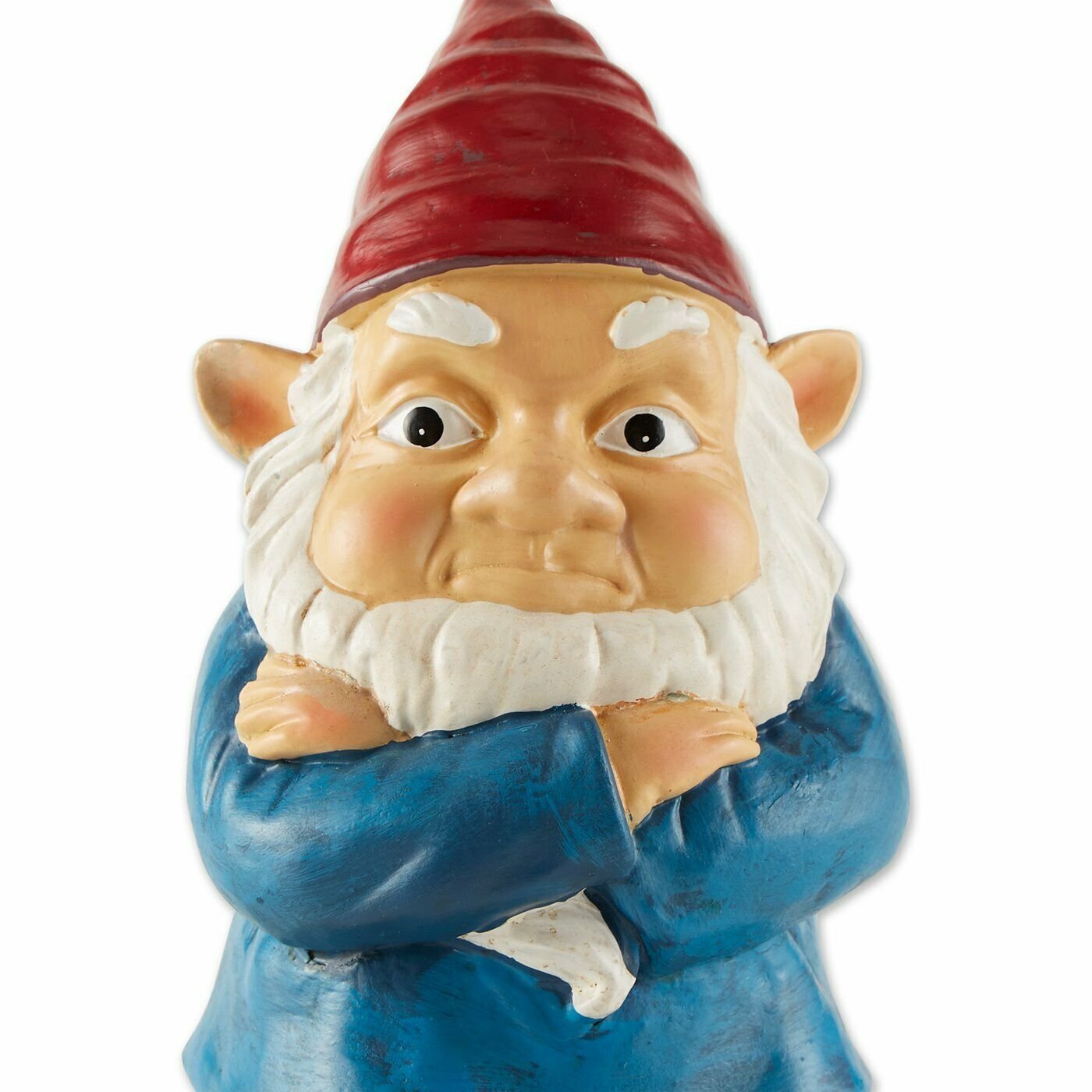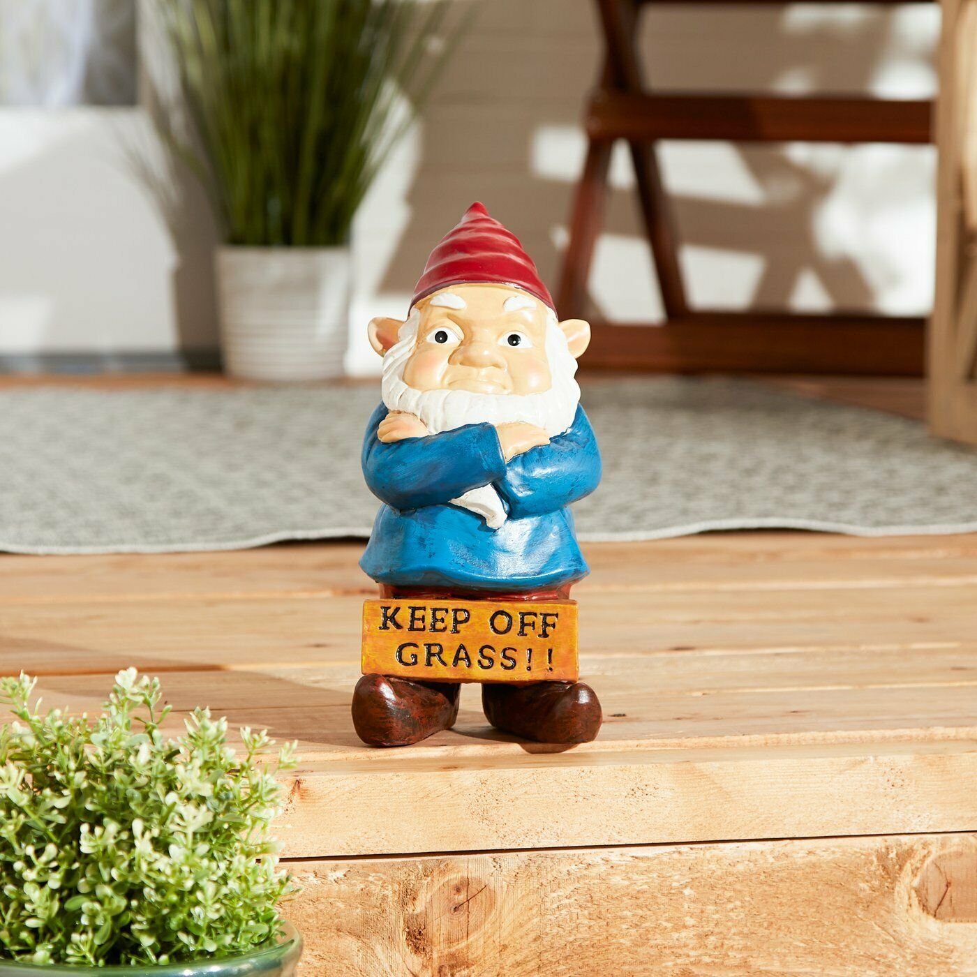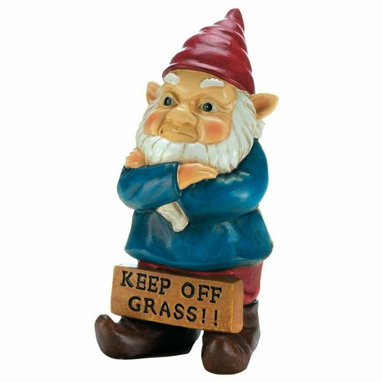 Don't cross this gnome! He's got a grumpy look and a sign that reads "Keep Off Grass!!" A funny and charming way to let folks know they need to stay clear of the yard. 1.6 pounds. 4.25 x 4.25 x 10 inches tall. Polyresin.