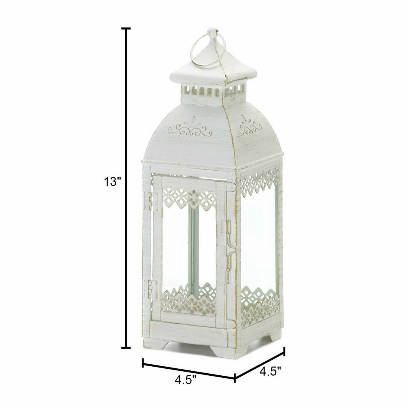 Create a chic candlelight display with this white metal lantern. The decorative lantern features an iron frame in an antique-white finish with gorgeous white lace detailing. One side has a hinged door for each access to candle. 2.2 pounds. 4.5 inches square x 13 inches tall. Iron frame with glass panels. Candle not included.