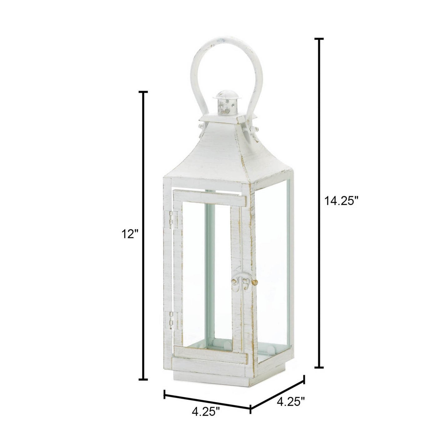 A fresh take on a traditional design, this distressed white candle lantern features a clean silhouette for an updated look. The iron frame has glass panes and is suitable for both indoor and outdoor spaces. Hang this metal lantern under a covered patio or place it on top of a table. One side has a hinged door for easy access to candle. 2 pounds. 4.25 x 4.5 x 12 inches tall. Iron frame with glass panels. Candle not included.