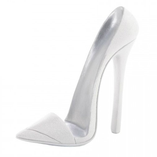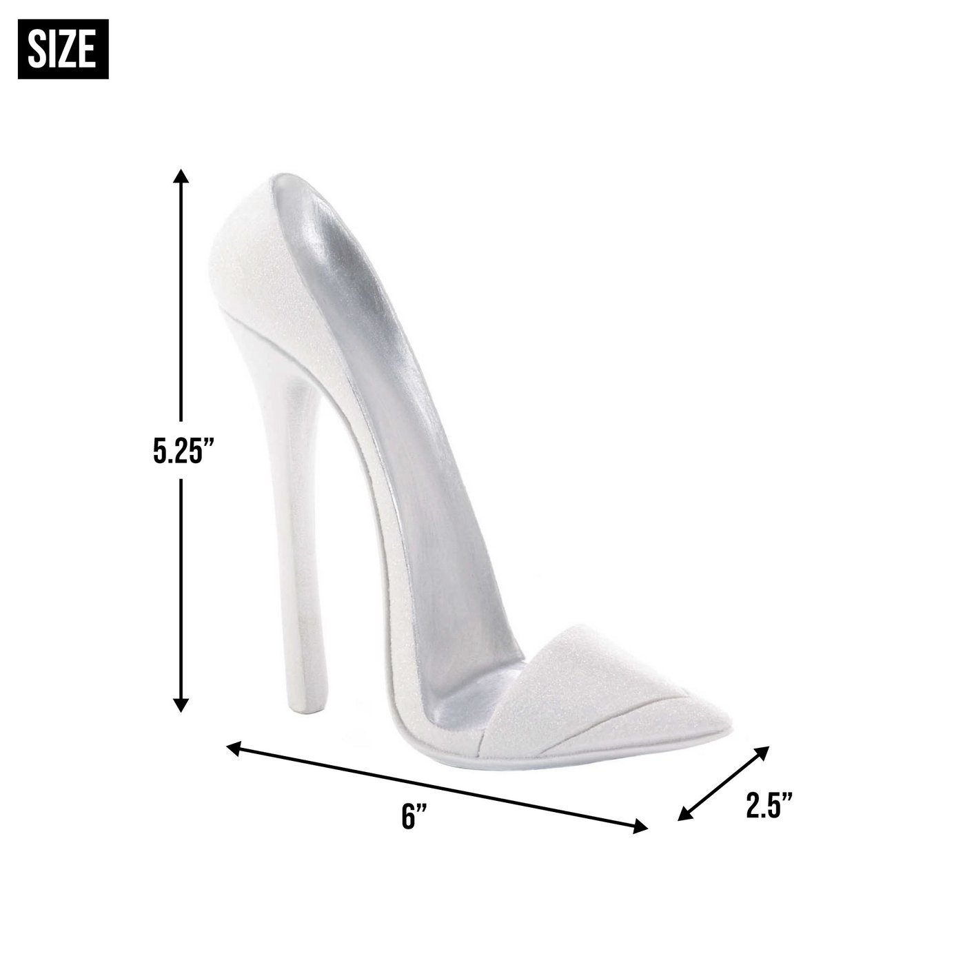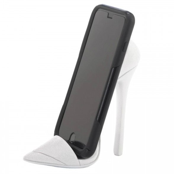 A super stylish way to keep a phone handy on a desk or counter. This white sparkly shoe features a high-fashion pointed toe and high heel that keeps the phone upright and easy to see. Contents not included. 0.4 pound. 6 x 2.5 x 5.25 inches tall. Polyresin.