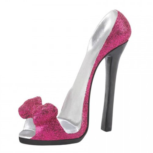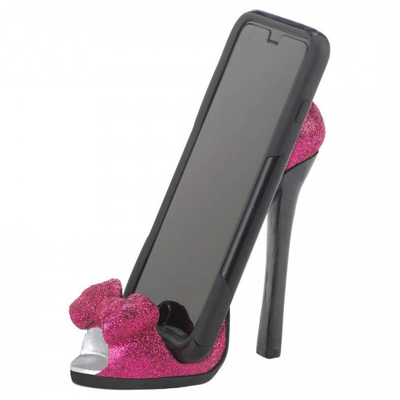 A super stylish way to keep a phone handy on a desk or counter. This pink sparkly shoe has a cute bow and features a high-fashion pointed toe and high heel that keeps the phone upright and easy to see. Contents not included. 0.4 pound. 5.25 x 2.5 x 5.5 inches tall. Polyresin.