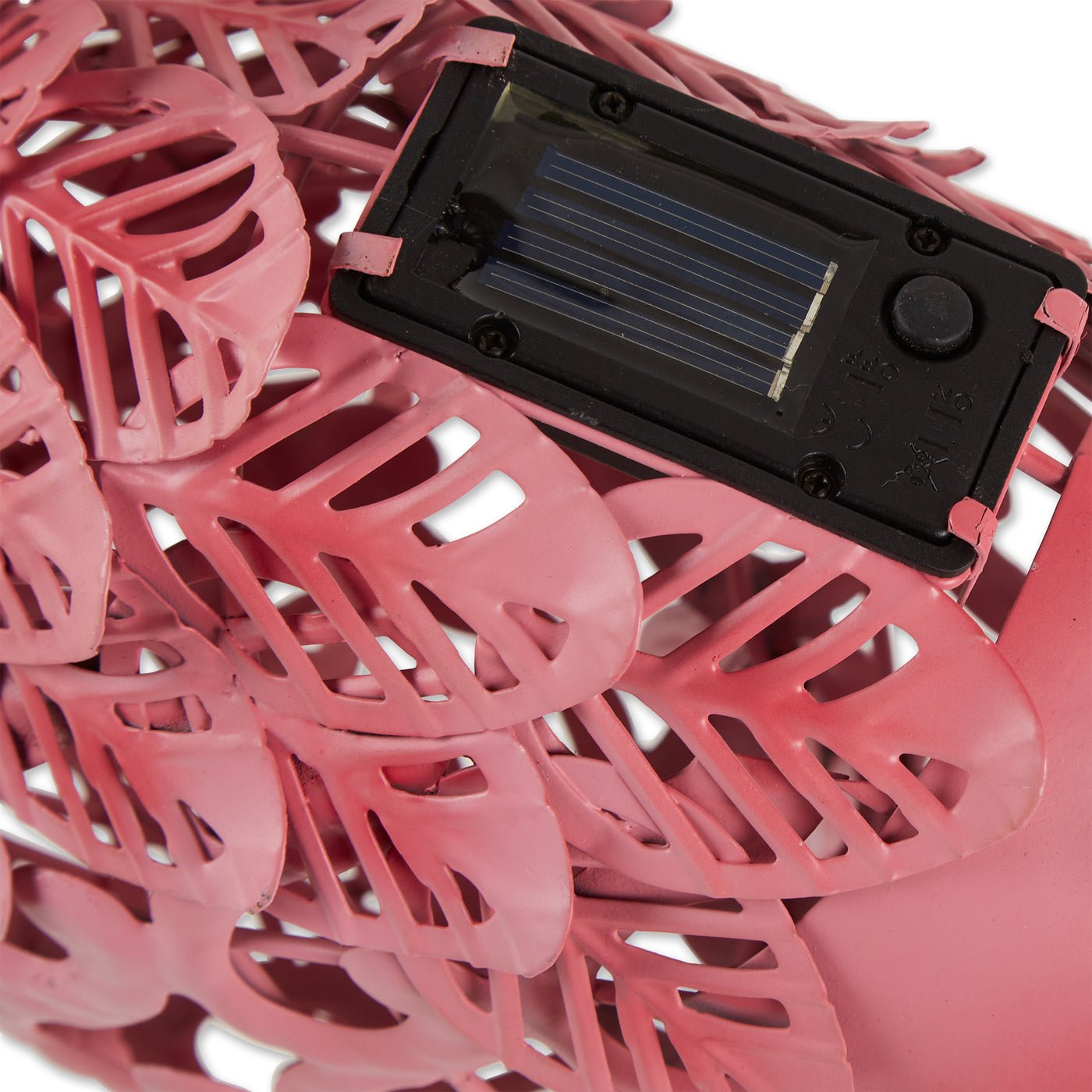 It's more than 2 feet tall! Whimsical pink lawn flamingo not only adds a pop of color to any yard or garden, it also has a solar-powered light inside. Iron frame with amazing details in the feathers. 2 pounds. 18.5 x 7 x 27 inches tall. Iron and plastic with solar panel.