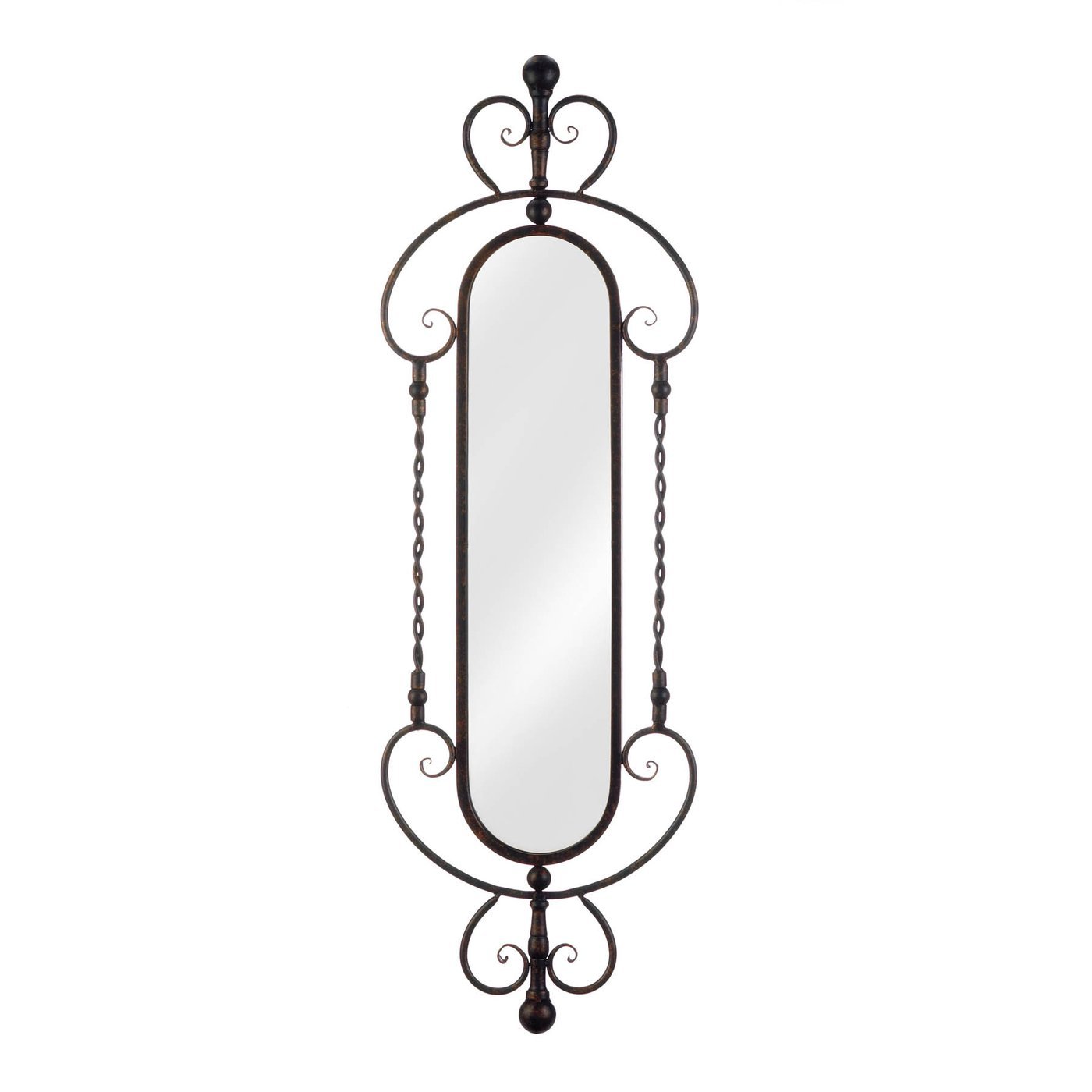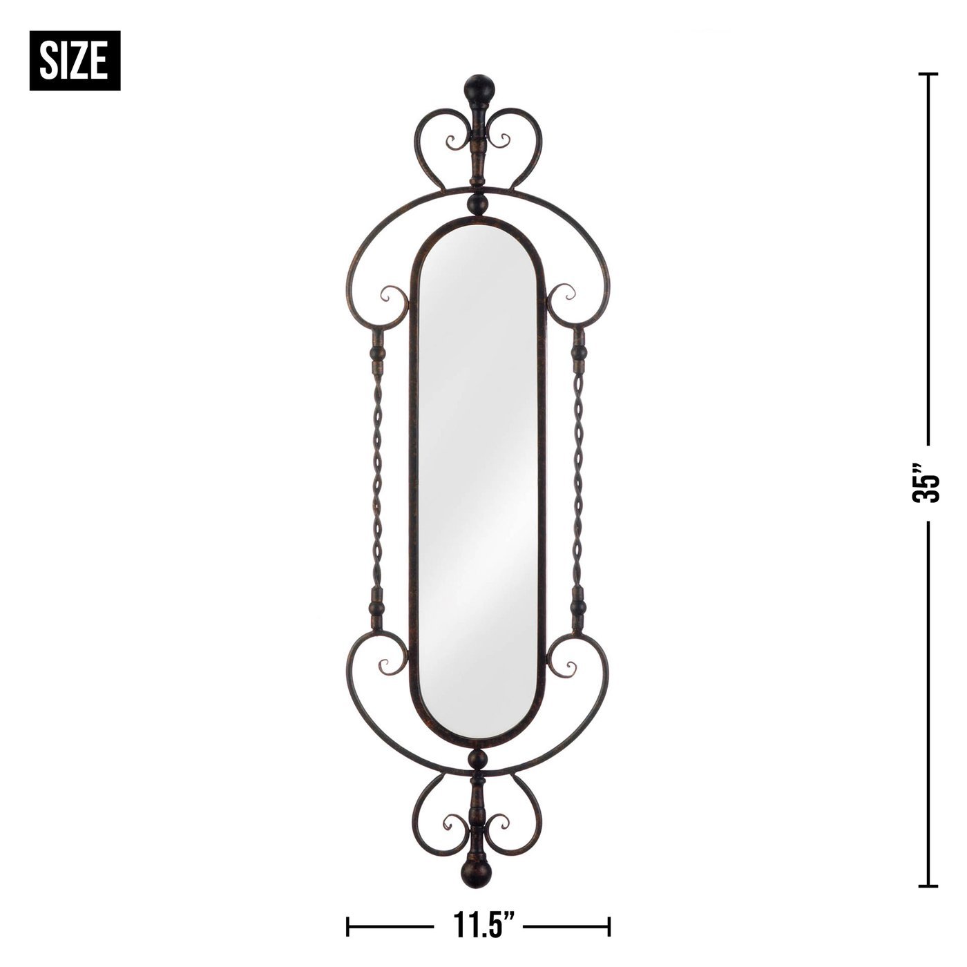 At nearly 3 feet tall, this unique mirror is a perfect fit for those tall, narrow spots in hallways and foyers. It has an eye-catching blend of modern and traditional design elements. Frame has a distressed bronze finish. 4.6 pounds. 11.5 x 1 x 35 inches tall. Iron, mirror, and MDF wood.