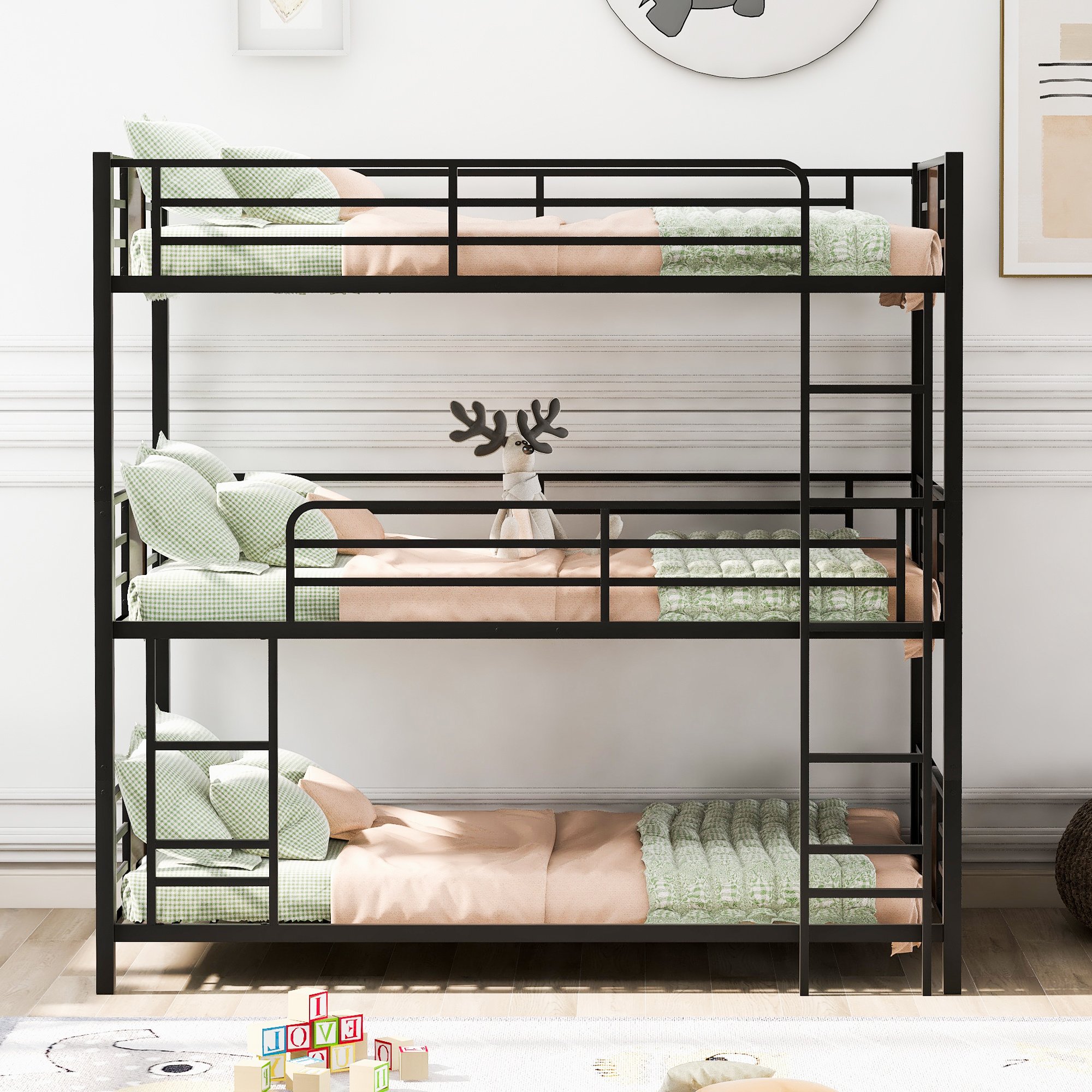This triple bunk bed is perfect for family which has multiple family members. Bunk design is space-saving and two ladders are attached to bed which provides easy access to top bed and middle bed. Constructed with heavy duty metal, the stacking three beds is securely strong and steady. Equipped with easy access slat guardrails keep you snug and secure. With space-saving design and sturdy construction, this bed will provide great experience.