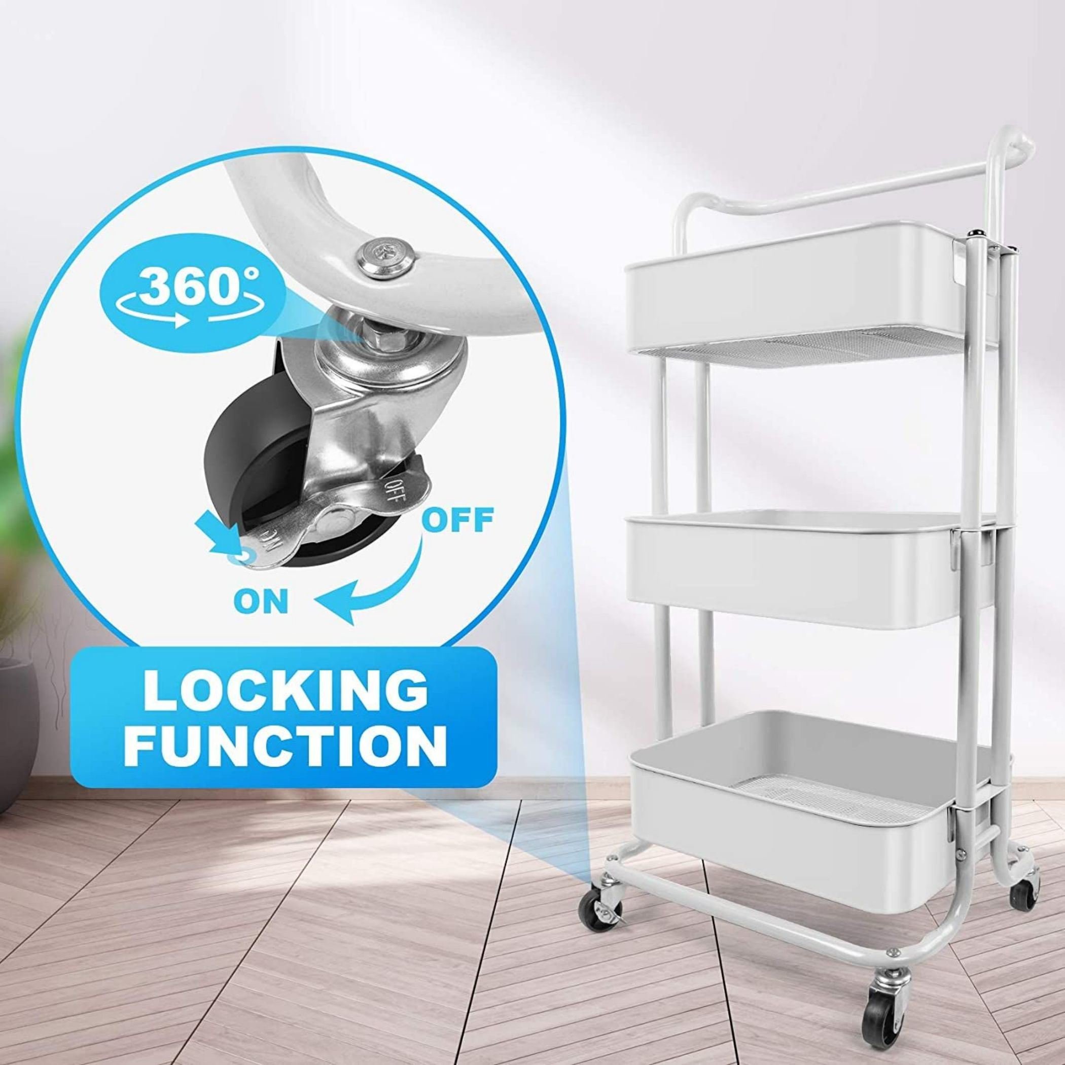 �� This wheeled trolley has three large and deep baskets; providing enough space for your daily necessities; children's supplies; office supplies; etc. Four wheels allow you to move easily; and two lockable wheels provide stability; enabling you to place the cart on the slope.�� Wheeled cart: This cart can be used as a tool cart; a service cart; a book cart or an organization rack for offices; bedrooms; kitchens; bathrooms; laundry rooms; pantries; studios; classrooms and process areas.It can add additional storage space for any room.�� Spacious storage capacity: This wheeled rolling cart provides three layers of large storage space; while saving floor space to optimize space utilization. The deep basket is designed to prevent objects from falling.�� Convenient to move: This three-layer rolling car is equipped with 4 wheels (2 lockable); and the handle design allows you to easily and easily roll to any place you need; or lock it in place.�� Different storage requirements can be customized: adjust the shelf or movable handle to meet various storage requirements. The utility car is equipped with the required tools and simple assembly instructions; so you can easily assemble the three-layer rolling car in 15-20 minutes.�� Rugged and durable: The rolling cart with wheels is made of high-quality metal materials; and each frame can bear 22 pounds. Three-layer rolling cart is the perfect choice for party night; which can provide guests with flowing drinks and ice buckets.Three-layer metal storage car provides sufficient spaceThe deep basket is designed to prevent objects from falling